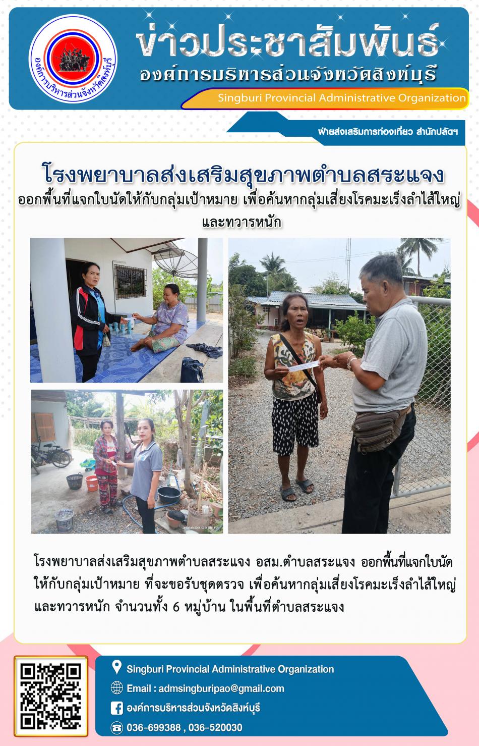 โรงพยาบาลส่งเสริมสุขภาพตำบลสระแจง ออกพื้นที่แจกใบนัดให้กับกลุ่มเป้าหมาย เพื่อค้นหากลุ่มเสี่ยงโรคมะเร็งลำไส้ใหญ่และทวารหนัก [7 มีนาคม 2568]