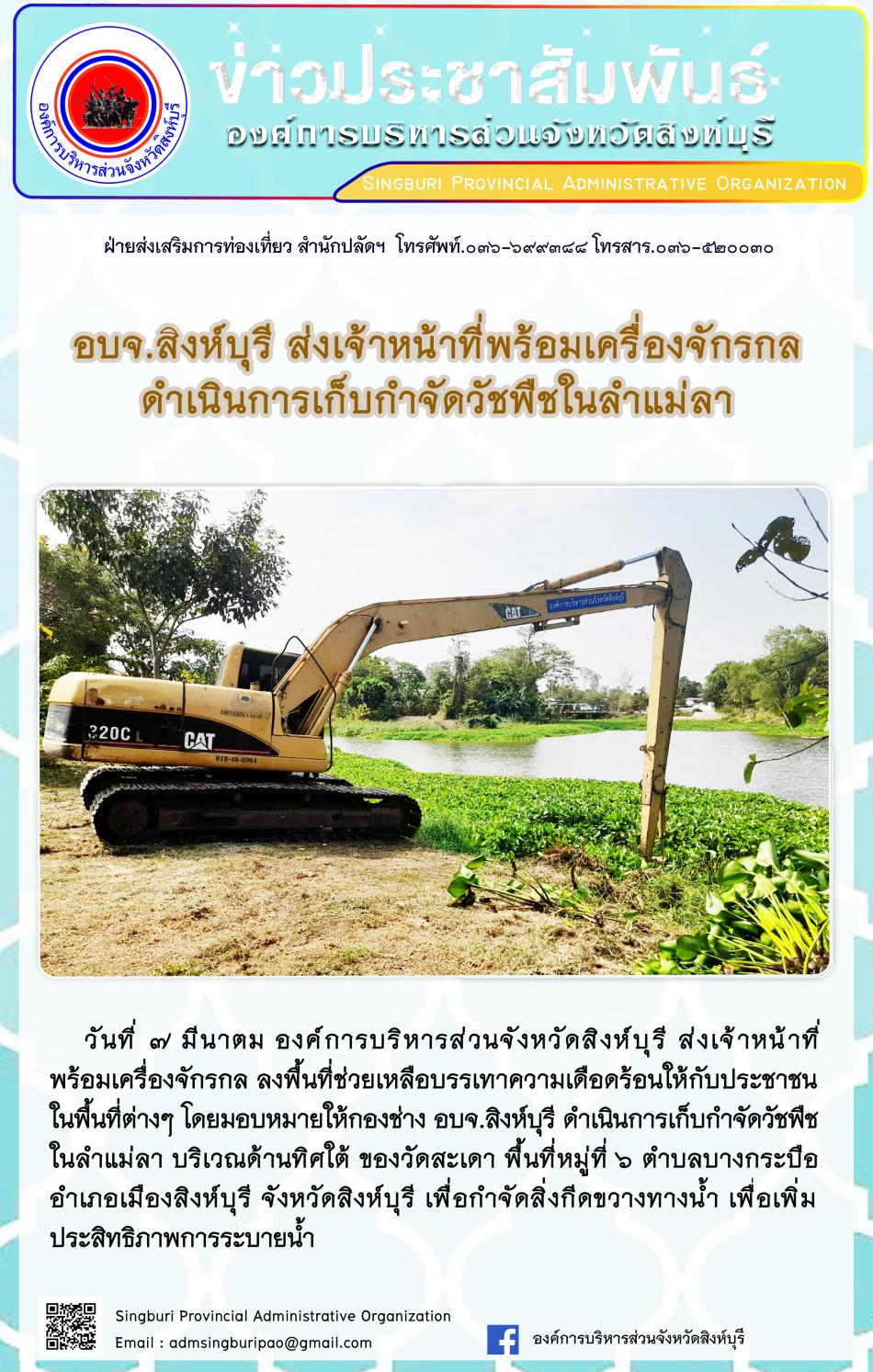 อบจ.สิงห์บุรี ส่งเจ้าหน้าที่พร้อมเครื่องจักรกล เก็บกำจัดวัชพืช บริเวณลำแม่ลา [7 มีนาคม 2568]