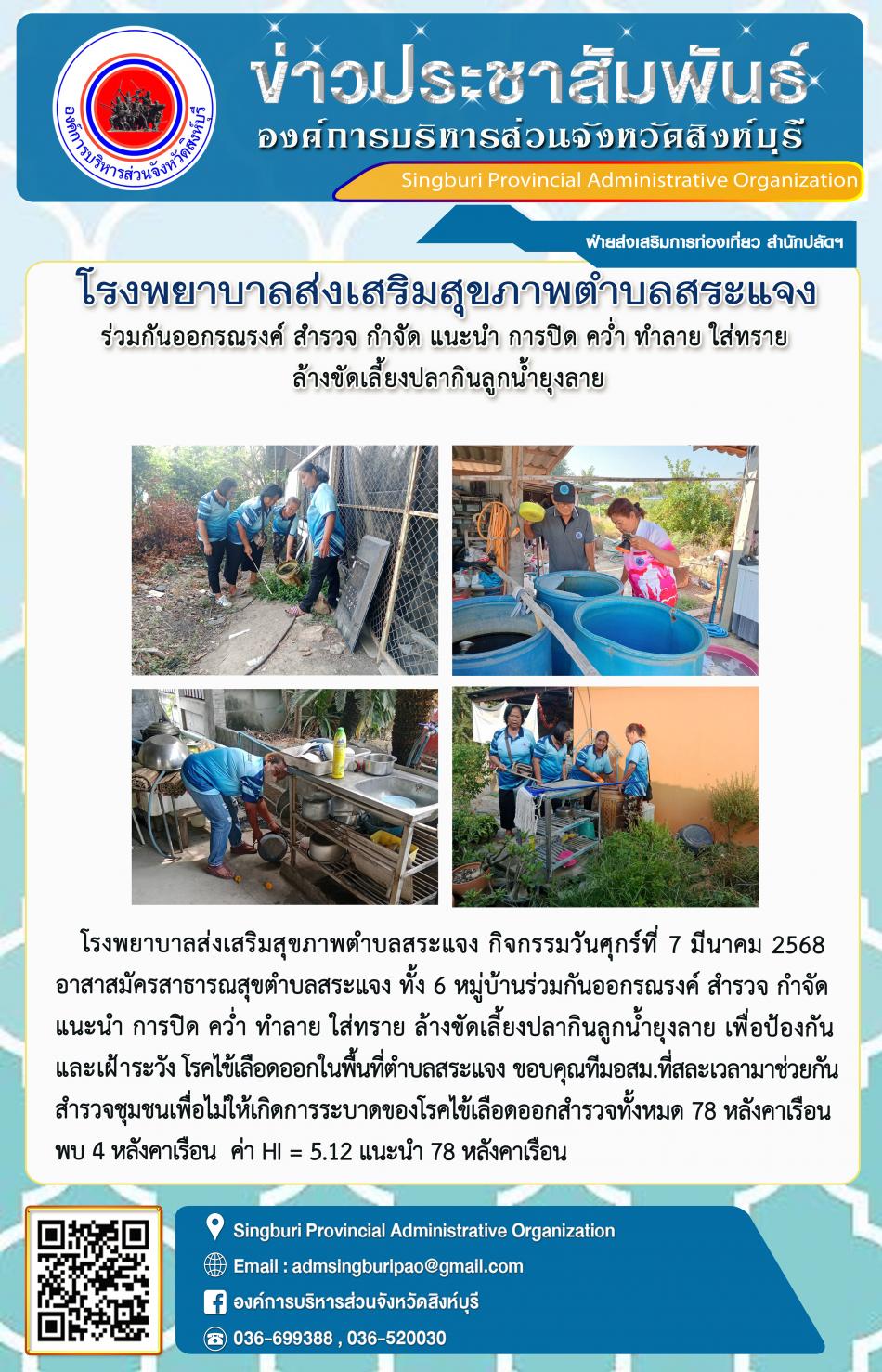 โรงพยาบาลส่งเสริมสุขภาพตำบลสระแจง ร่วมกันออกรณรงค์ สำรวจ กำจัด แนะนำ การปิด คว่ำ ทำลาย ใส่ทราย ล้างขัดเลี้ยงปลากินลูกน้ำยุงลาย เพื่อป้องกันและเฝ้า โรคไข้เลือดออก [7 มีนาคม 2568]