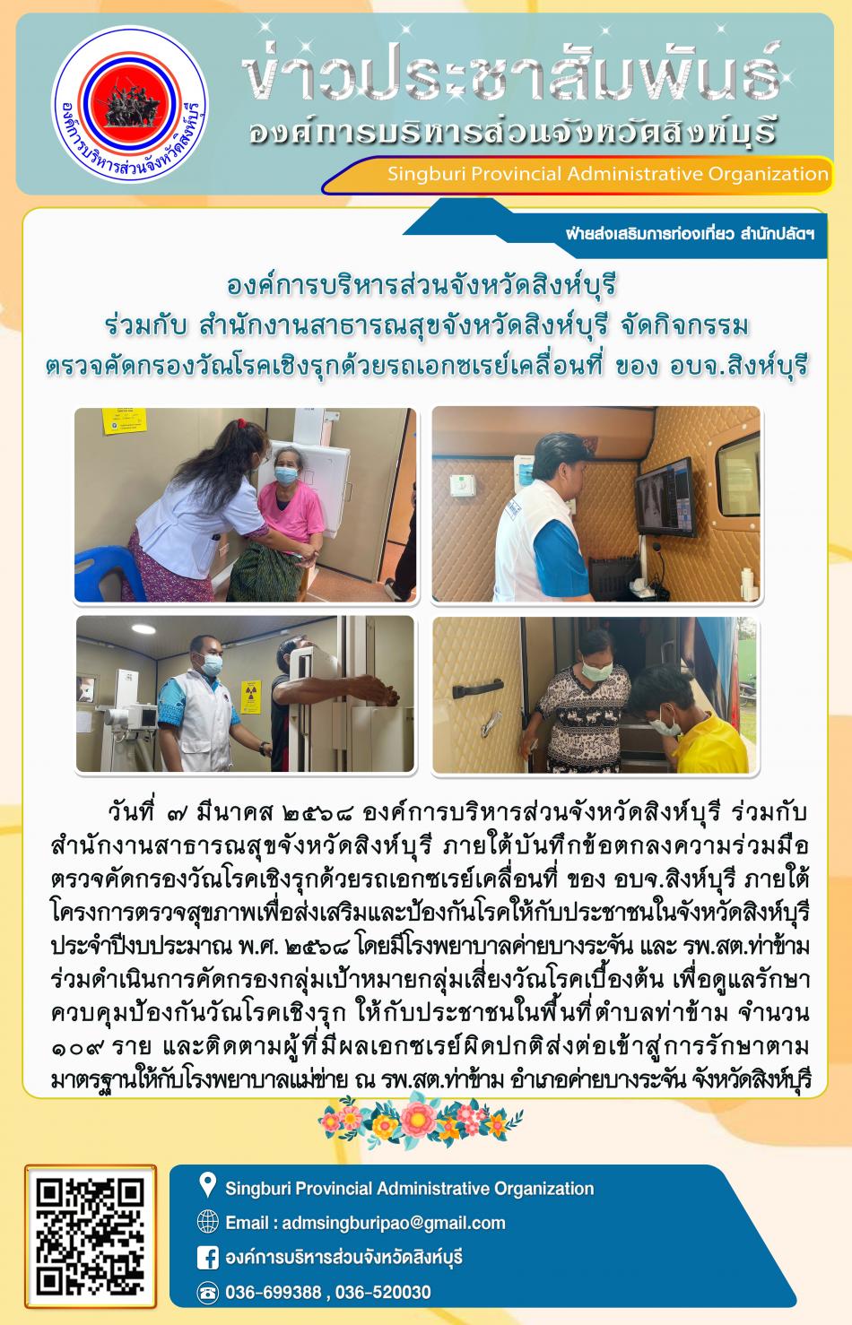 องค์การบริหารส่วนจังหวัดสิงห์บุรี ร่วมกับสาธาณสุขจังหวัดสิงห์บุรี จัดกิจกรรมตรวจคัดกรองวัณโรคเชิงรุกด้วยรถเอกซเรย์เคลื่อนที่ องค์การบริหารส่วนจังหวัดสิงห์บุรี ในพื้นที่อำเภอค่ายบางระจัน [7 มีนาคม 2568]
