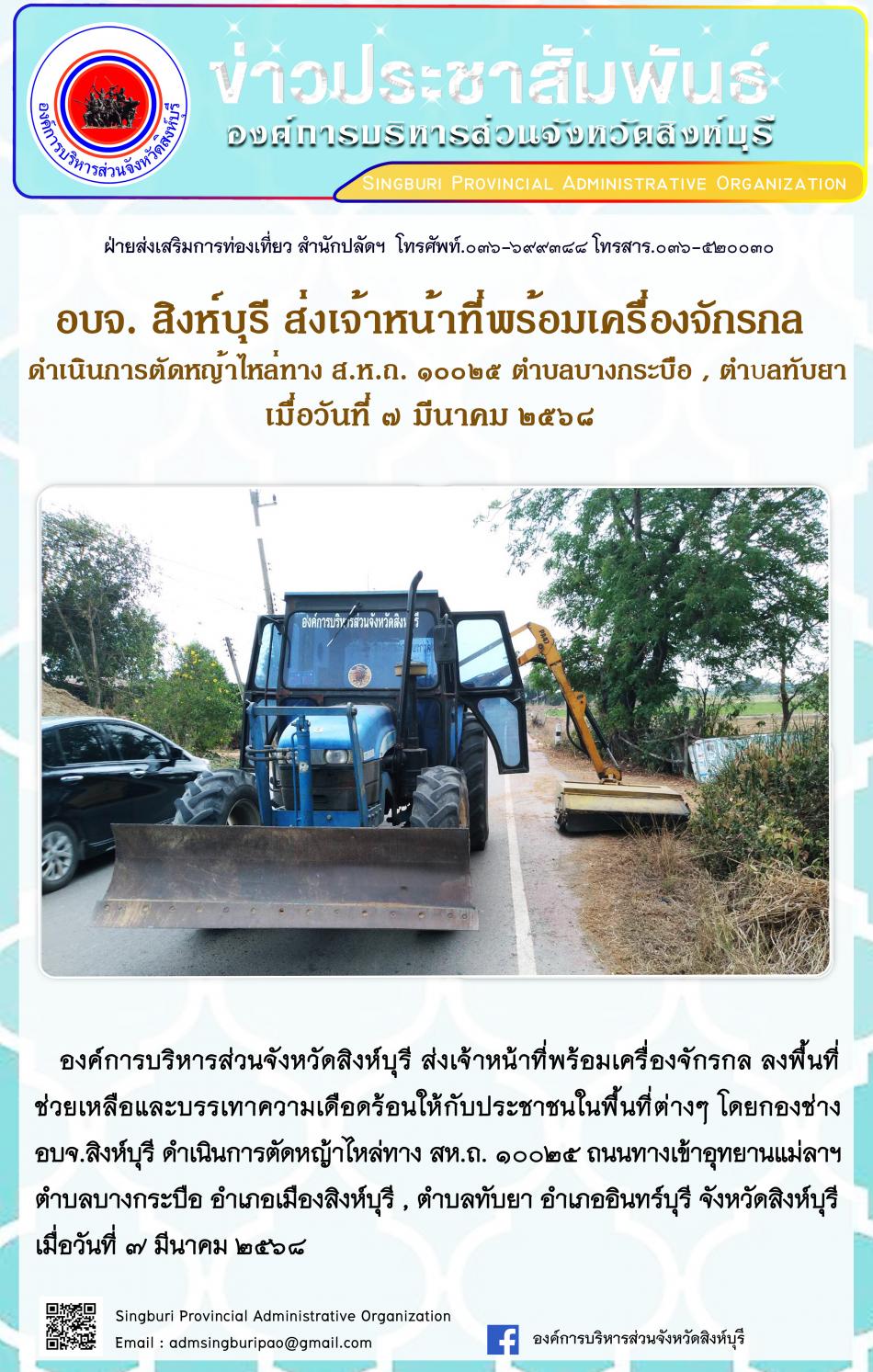 อบจ.สิงห์บุรี ส่งเจ้าหน้าที่พร้อมเครื่องจักรกล ดำเนินการตัดหญ้าไหล่ทาง ส.ห.ถ.1002 ตำบลบางกระบือ - ตำบลแม่ลา [7 มีนาคม 2568]