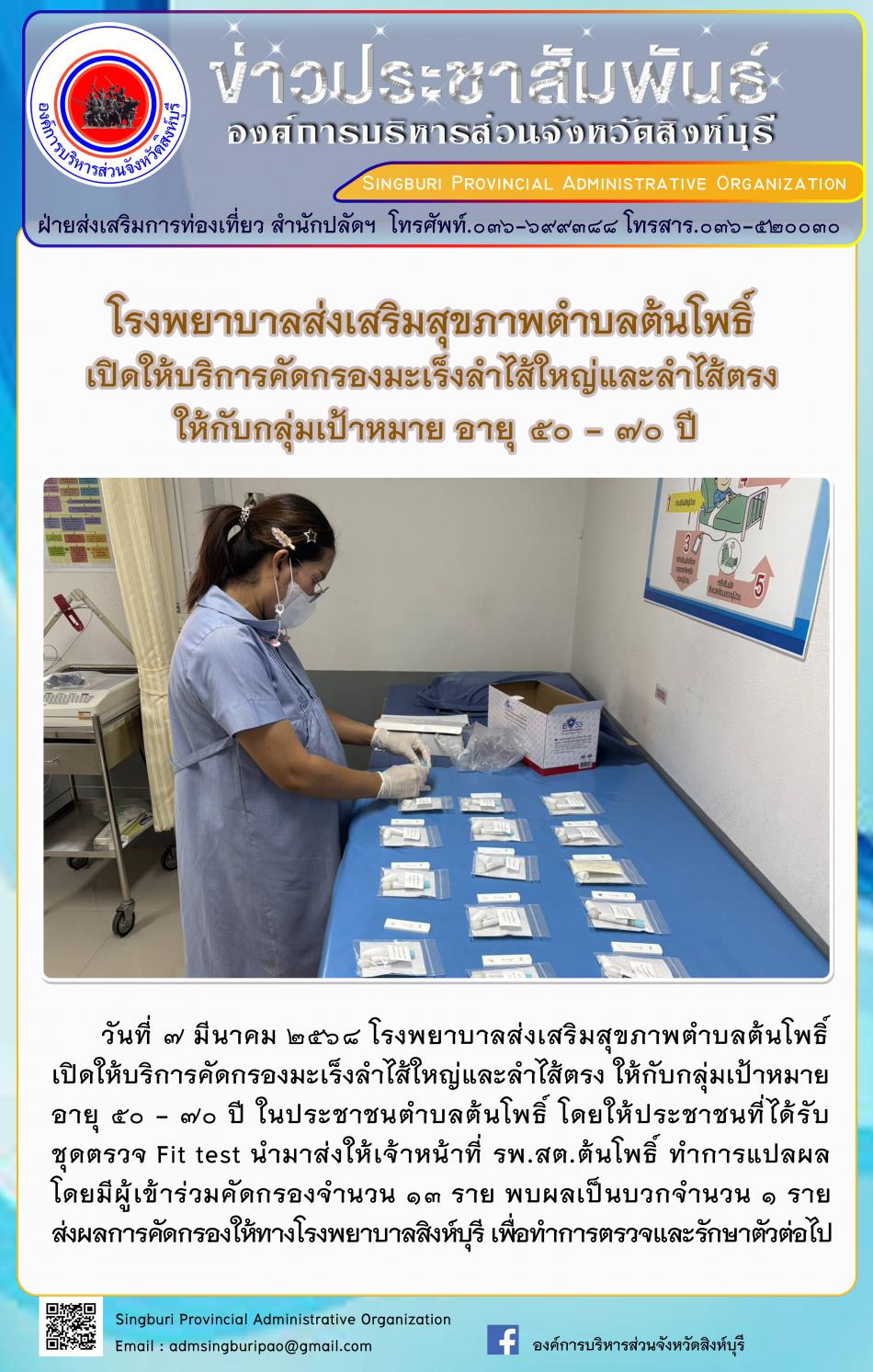 โรงพยาบาลส่งเสริมสุขภาพตำบลต้นโพธิ์ เปิดให้บริการคัดกรองมะเร็งลำไส้ใหญ่และลำไส้ตรงให้กับกลุ่มเป้าหมาย อายุ 50- 70 ปี [7 มีนาคม 2568]