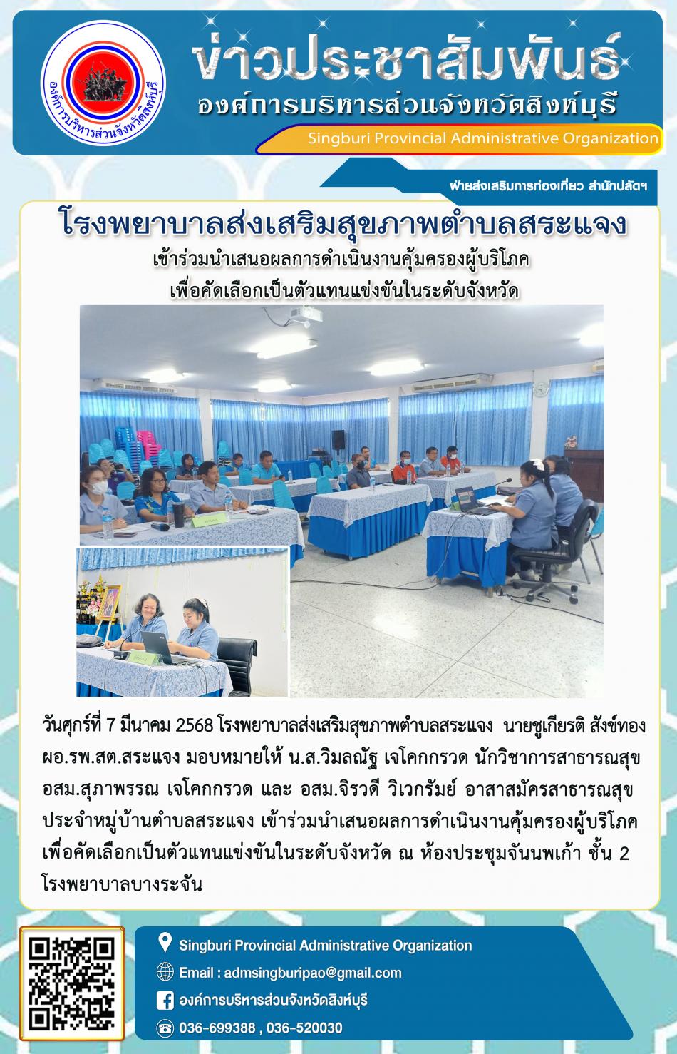 โรงพยาบาลส่งเสริมสุขภาพตำบลสระแจง เข้าร่วมนำเสนอผลการดำเนินงานคุ้มครองผู้บริโภค เพื่อคัดเลือกเป็นตัวแทนแข่งขันในระดับจังหวัด [7 มีนาคม 2568]