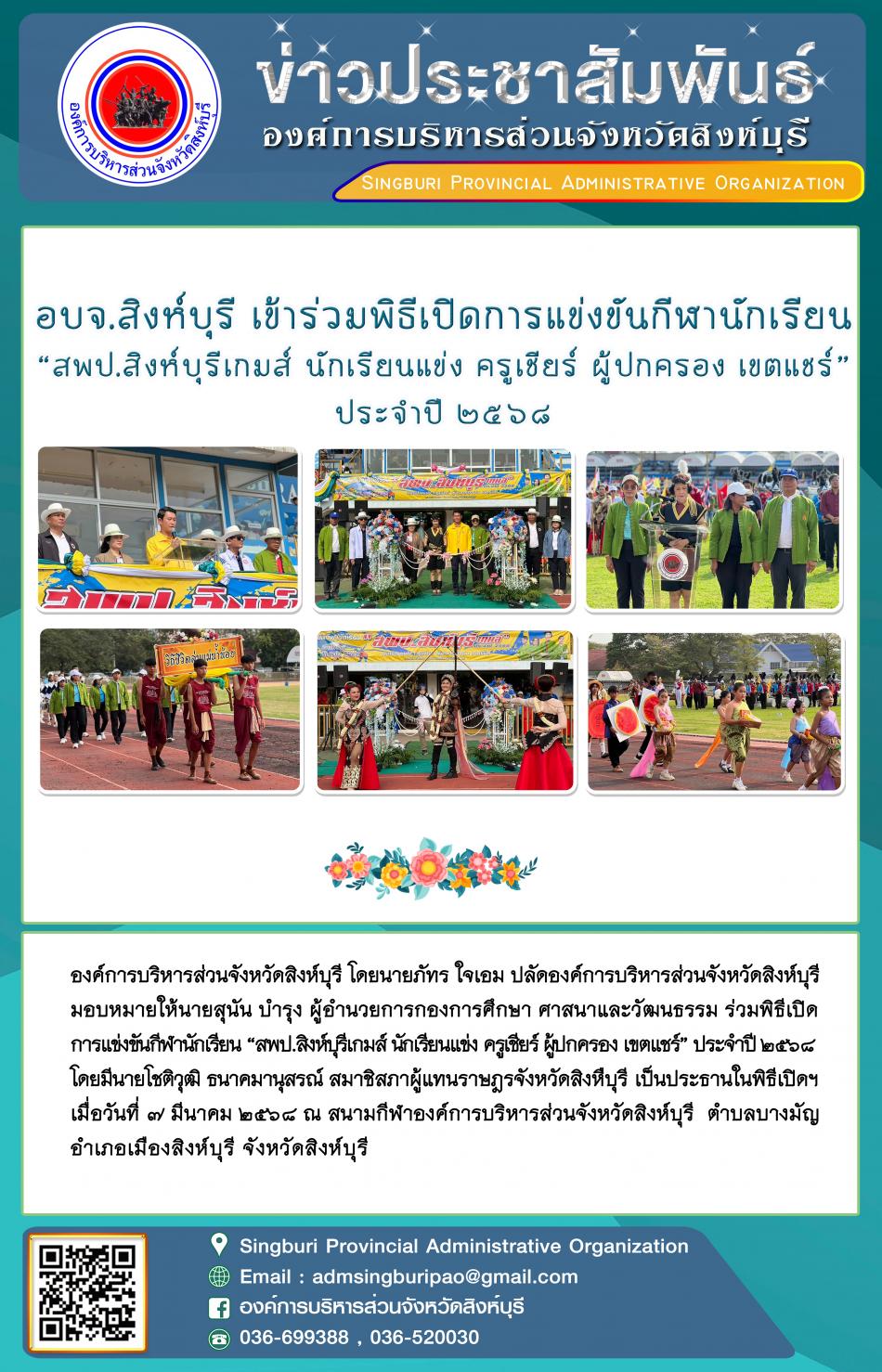 อบจ.สิงห์บุรี เข้าร่วมพิธีเปิดการแข่งขันกีฬานักเรียน"สพป.สิงห์บุรีเกมส์ นักเรียนแข่ง ครูเชียร์ ผู้ปกครองชม เขตแชร์" ประจำปี 2568 [7 มีนาคม 2568]