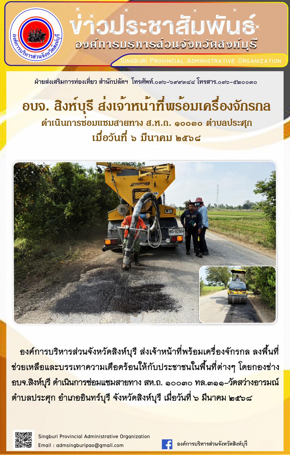 อบจ.สิงห์บุรี ส่งเจ้าหน้าที่พร้อมเครื่องจักรกล ดำเนินการซ่อมแซมสายทาง ส.ห.ถ.10030 ตำบลประศุก [6 มีนาคม 2568]