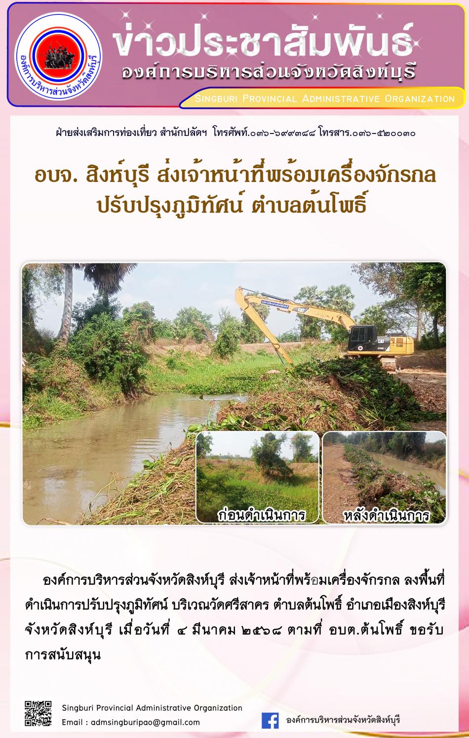 อบจ.สิงห์บุรี ส่งเจ้าหน้าที่พร้อมเครื่องจักรกล ปรับปรุงภูมิทัศน์ ตำบลต้นโพธิ์ [4 มีนาคม 2568]