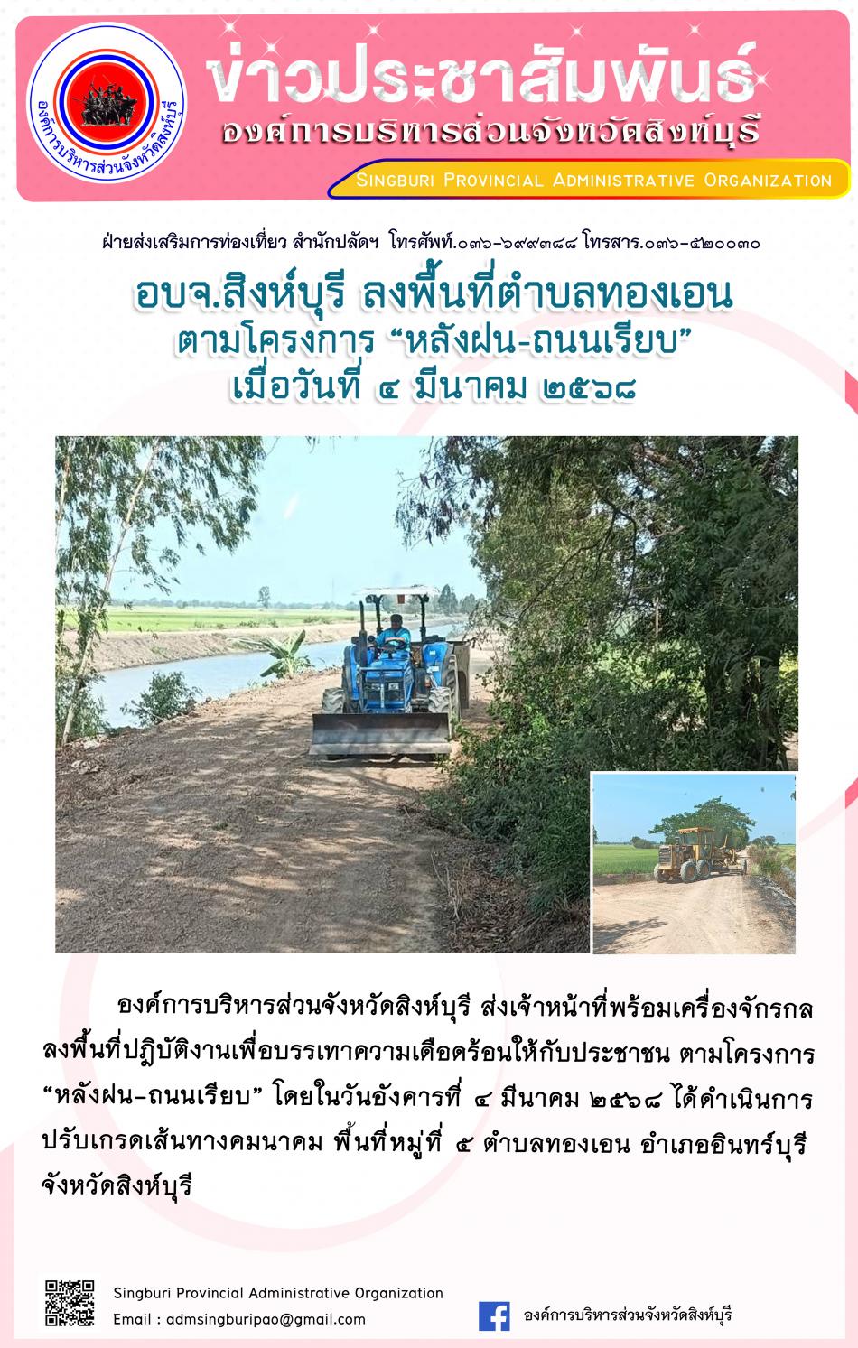 อบจ.สิงห์บุรี ลงพื้นที่ ตำบลทองเอน ตามโครงการ "หลังฝน - ถนนเรียบ" [4 มีนาคม 2568]