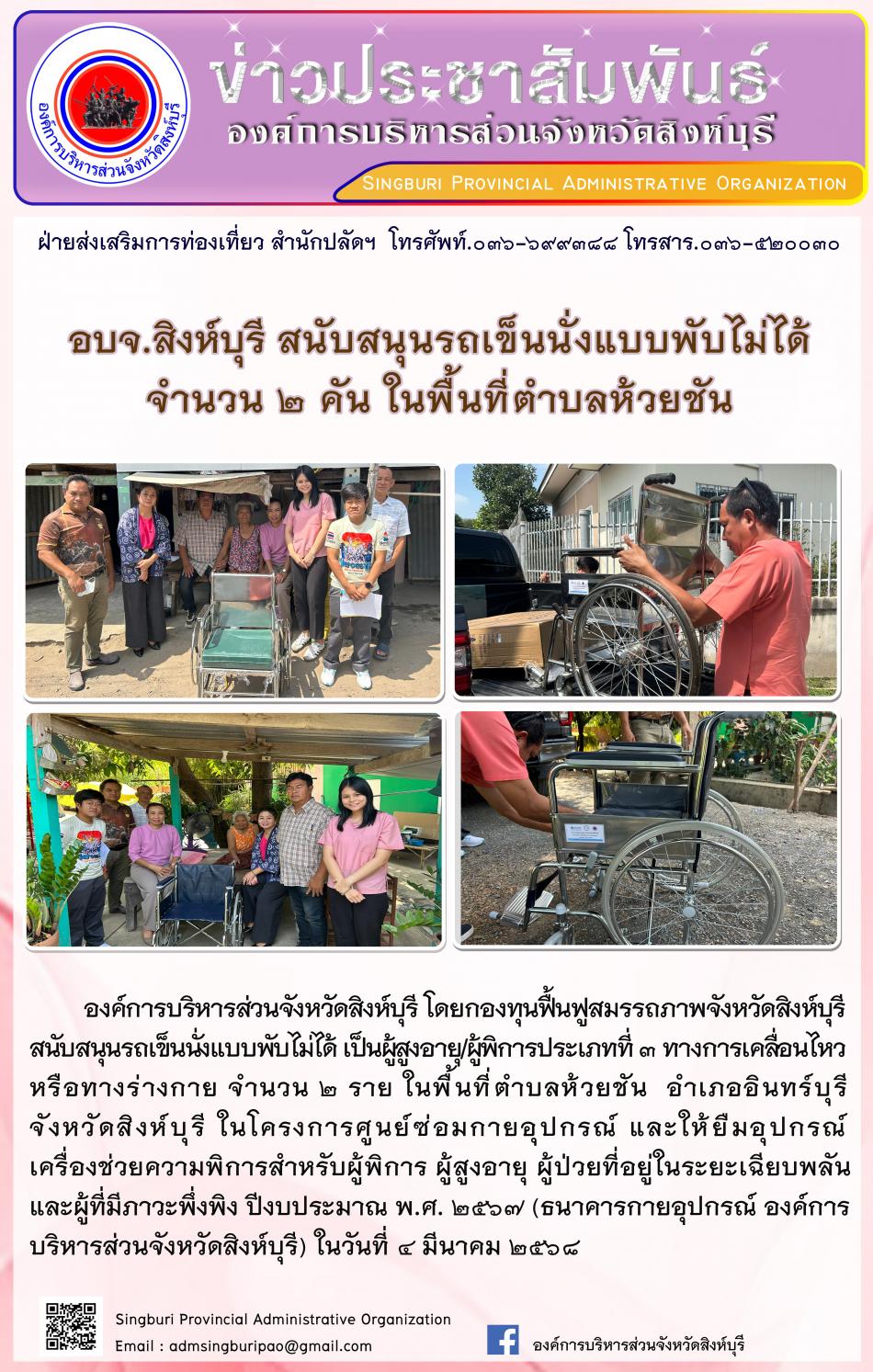 อบจ.สิงห์บุรี สนับสนุนรถเข็นนั่งแบบมาตรฐานแบบพับไม่ได้ จำนวน 2 คัน ในพื้นที่ตำบลห้วยชัน [4 มีนาคม 2568]