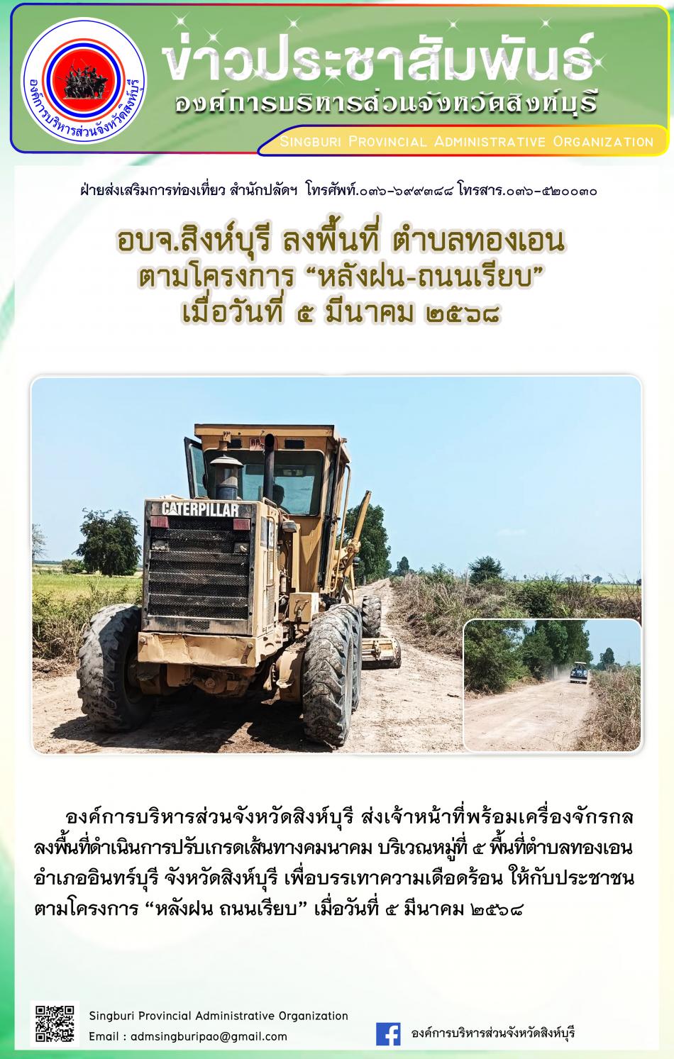อบจ.สิงห์บุรี ลงพื้นที่ ตำบลทองเอน ตามโครงการ "หลังฝน - ถนนเรียบ" [5 มีนาคม 2568]