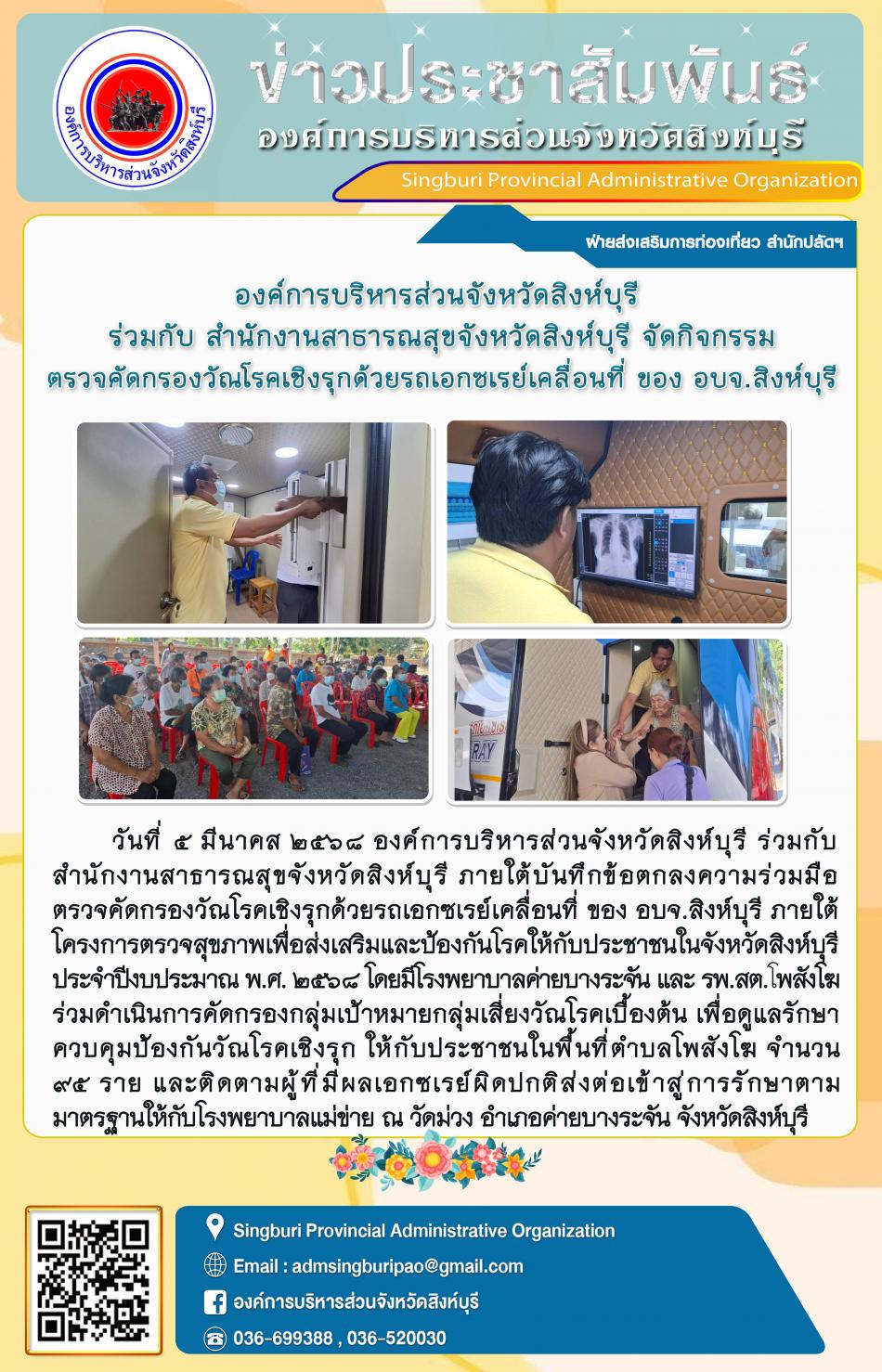 องค์การบริหารส่วนจังหวัดสิงห์บุรี ร่วมกับสาธาณสุขจังหวัดสิงห์บุรี จัดกิจกรรมตรวจคัดกรองวัณโรคเชิงรุกด้วยรถเอกซเรย์เคลื่อนที่ องค์การบริหารส่วนจังหวัดสิงห์บุรี ในพื้นที่อำเภอค่ายบางระจัน [5 มีนาคม 2568]