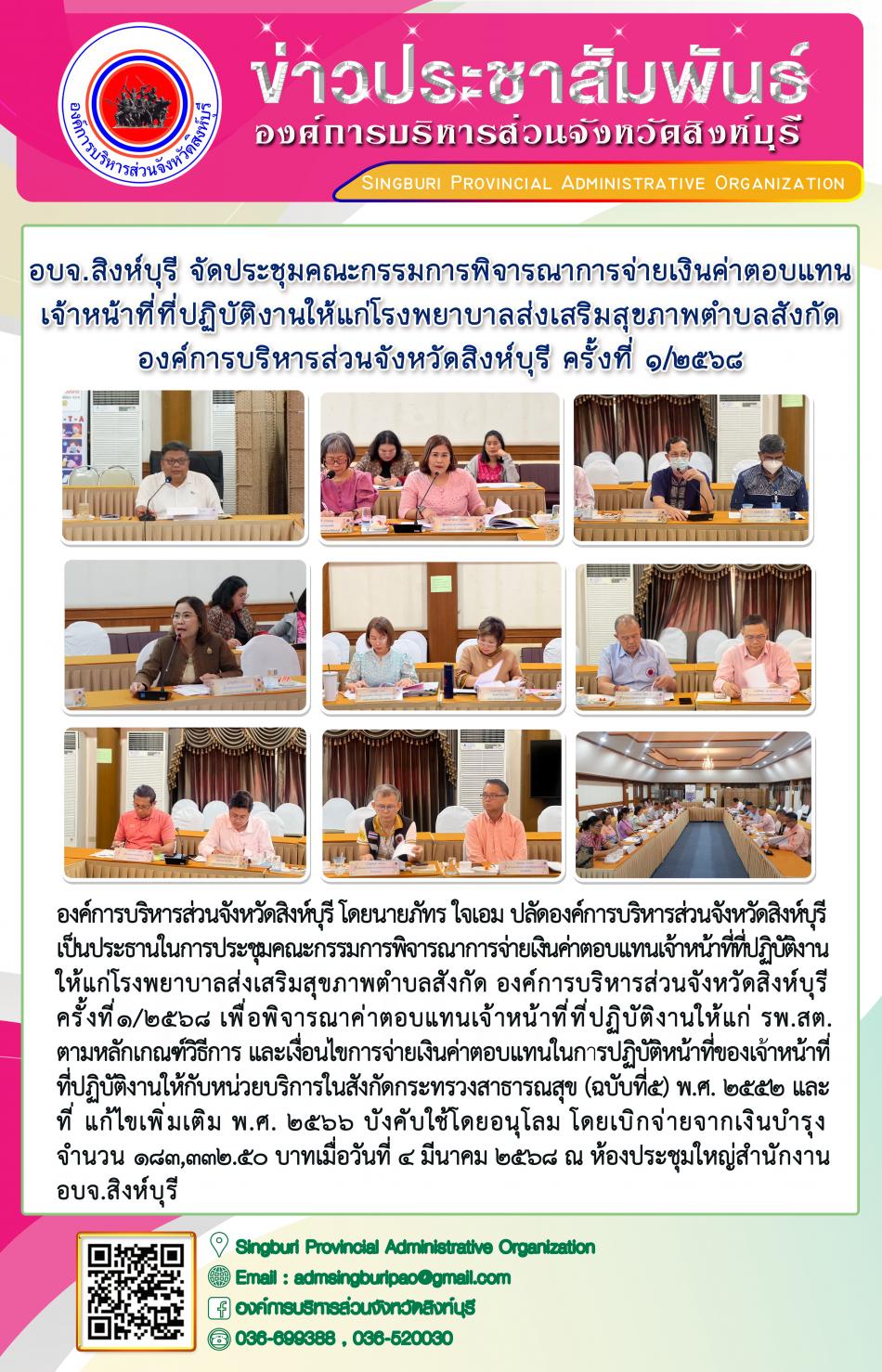 อบจ.สิงห์บุรี จัดการประชุมคณะกรรมการพิจารณาจ่ายเงินค่าตอบแทนเจ้าหน้าที่ที่ปฏิบัติงานให้แก่โรงพยาบาลส่งเสริมสุขภาพตำบลสังกัดองค์การบริหารส่วนจังหวัดสิงห์บุรี ครั้งที่ 1/2568 [4 มีนาคม 2568]