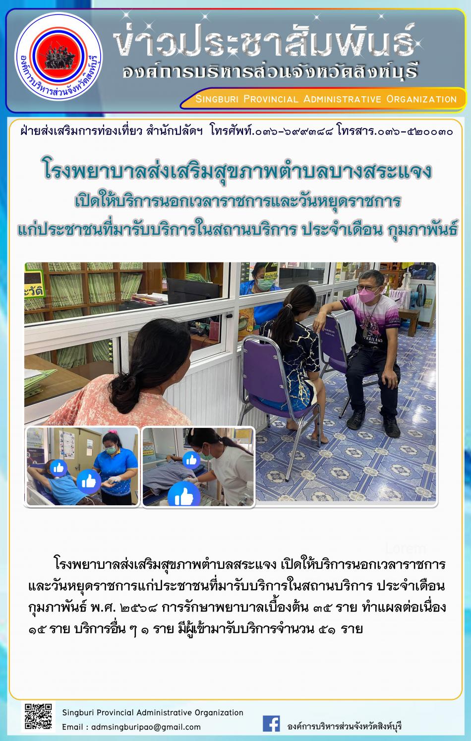 โรงพยาบาลส่งเสริมสุขภาพตำบลสระแจง เปิดให้บริการนอกเวลาราชการและวันหยุดราชการ แก่ประชาชนที่มารับบริการในสถานบริการ ประจำเดือน กุมภาพันธ์ [28 กุมภาพันธ์ 2568]