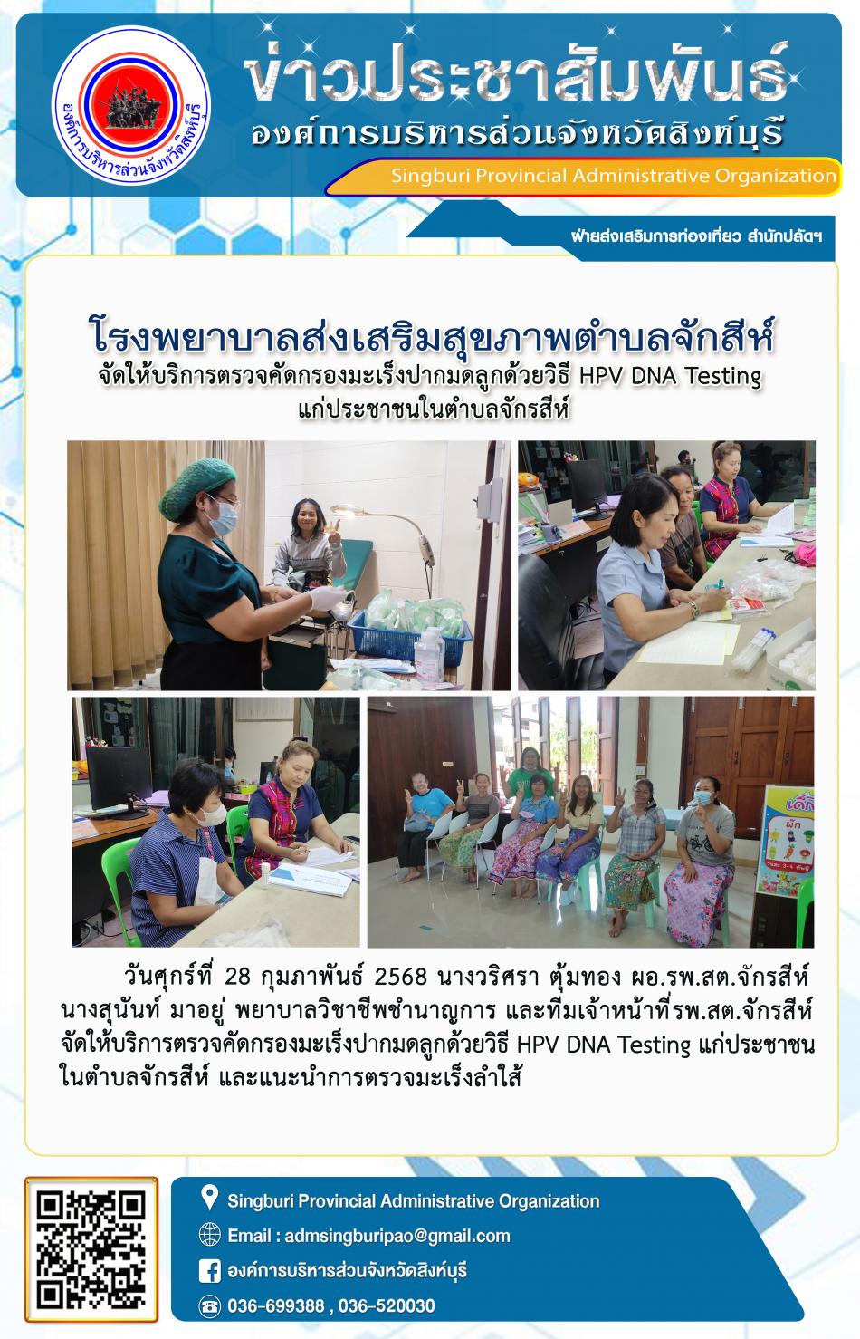 โรงพยาบาลส่งเสริมสุขภาพตำบลจักรสีห์ จัดให้บริการตรวจคัดกรองมะเร็งปาดมดลูกด้วยวิธี HPV DNA Testing แก่ประชาชนในตำบลจักรสีห์ [28 กุมภาพันธ์ 2568]