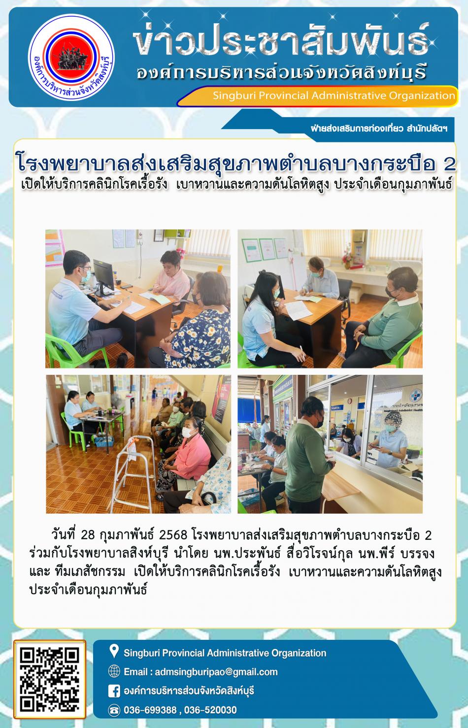 โรงพยาบาลส่งเสริมสุขภาพตำบลบางกระบือ 2 เปิดให้บริการคลินิกโรคเรื้อรัง เบาหวานและความดันโลหิตสูง ประจำเดือนกุมภาพันธ์ [28 กุมภาพันธ์ 2568]