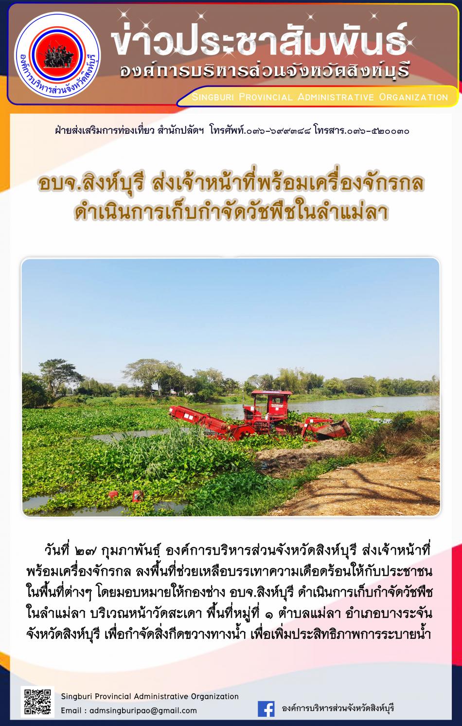 อบจ.สิงห์บุรี ส่งเจ้าหน้าที่พร้อมเครื่องจักรกล เก็บกำจัดวัชพืช บริเวณลำแม่ลา [27 กุมภาพันธ์ 2568]