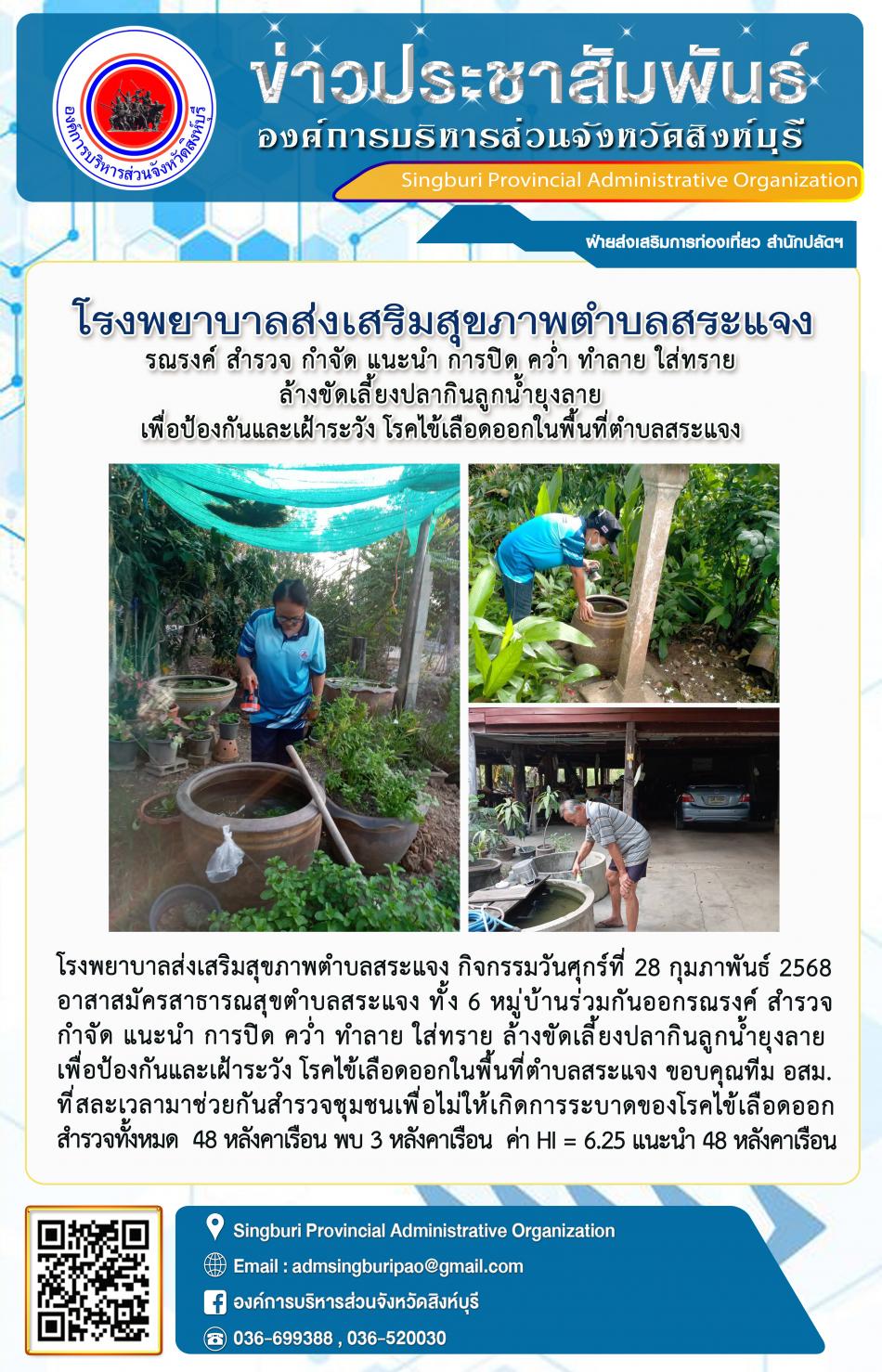 โรงพยาบาลส่งเสริมสุขภาพตำบลสระแจง ร่วมกันออกรณรงค์ สำรวจ กำจัด แนะนำ การปิด คว่ำ ทำลาย เพื่อป้องกันและเฝ้าระวัง โรคไข้เลือดออกในพื้นที่ตำบลสระแจง [28 กุมภาพันธ์ 2568]