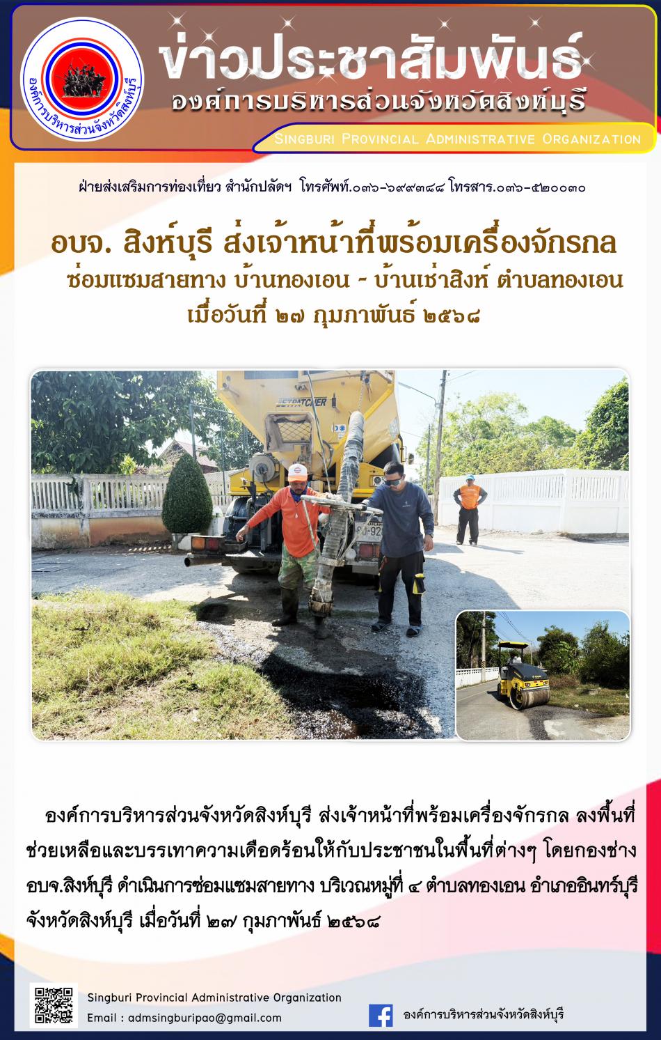 อบจ.สิงห์บุรี ส่งเจ้าหน้าที่พร้อมเครื่องจักรกล ซ่อมแซมสายทาง บ้านทองเอน - บ้านเซ่าสิงห์ ตำบลทองเอน [27 กุมภาพันธ์ 2568]