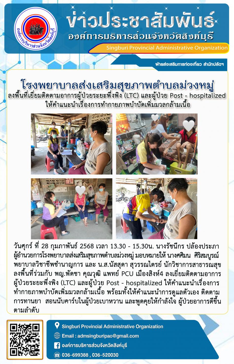โรงพยาบาลส่งเสริมสุขภาพตำบลม่วงหมู่ ลงเยี่ยมและติดตามอาการผู้ป่วยระยะพึ่งพิง (LTC) และผู้ป่วย Post - Hospitalized พร้อมทั้งให้คำแนะนำเรื่องการทำกายภาพบำบัดเพิ่มมวลกล้ามเนื้อ [28 กุมภาพันธ์ 2568]