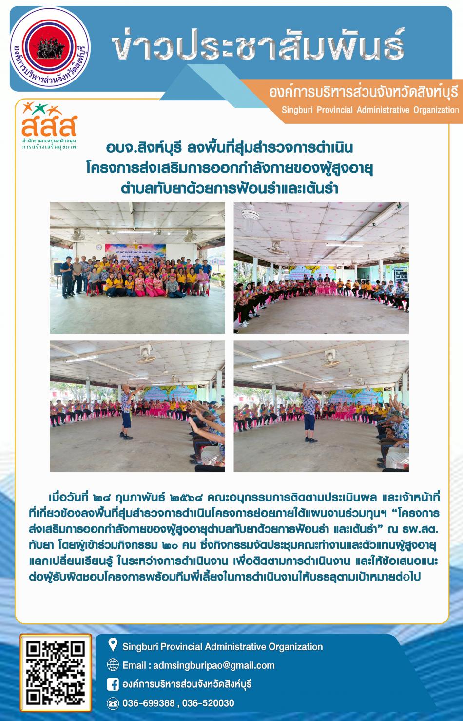 อบจ.สิงห์บุรี ลงพื้นที่สุ่มสำรวจการดำเนินโครงการส่งเสริมการออกกำลังกายของผู้สูงอายุ ตำบลทับยาด้วยการฟ้อนรำและเต้นรำ [28 กุมภาพันธ์ 2568]