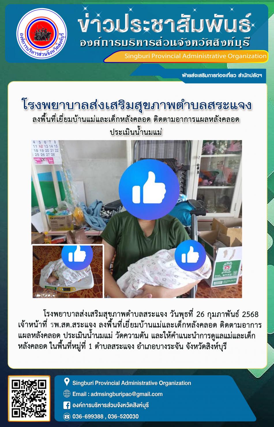 โรงพยาบาลส่งสริมสุขภาพตำบลสระแจง ลงพื้นที่เยี่ยมบ้านแม่และเด็กหลังคลอด ติดตามอาการแผลหลังคลอด ประเมินน้ำนมแม่ [26 กุมภาพันธ์ 2568]