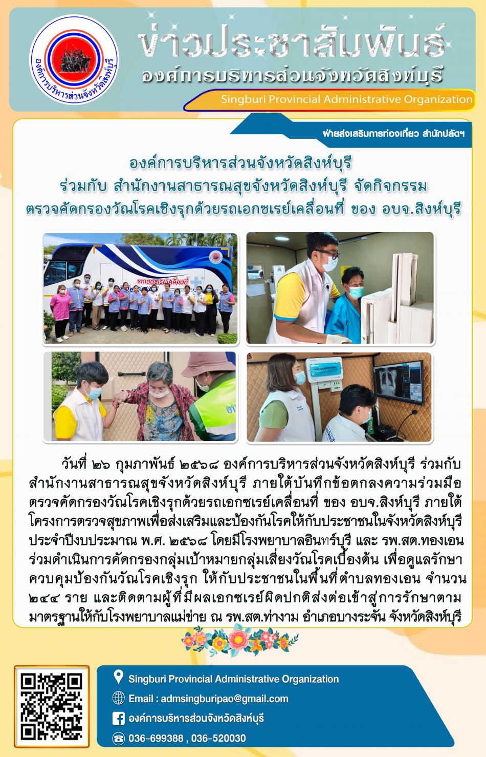 องค์การบริหารส่วนจังหวัดสิงห์บุรี ร่วมกับสาธาณสุขจังหวัดสิงห์บุรี จัดกิจกรรมตรวจคัดกรองวัณโรคเชิงรุกด้วยรถเอกซเรย์เคลื่อนที่ องค์การบริหารส่วนจังหวัดสิงห์บุรี ในพื้นที่ตำบลท่างาม [26 กุมภาพันธ์ 2568]