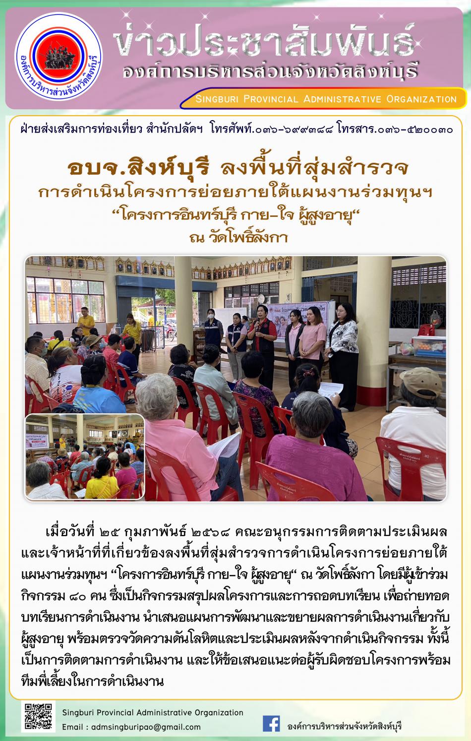 อบจ.สิงห์บุรี ลงพื้นที่สุ่มตรวจสำรวจการดำเนินโครงการย่อยภายใต้แผนงานร่วมทุนฯ"โครงการอิทร์บุรี กาย - ใจ ผู้สูงอายุ" ณ วัดโพธิ์ลังกา [25 กุมภาพันธ์ 2568]