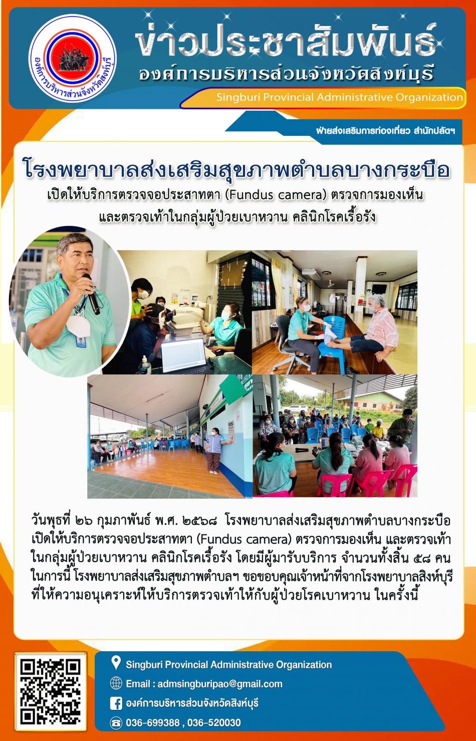 โรงพยาบาลส่งเสริมสุขภาพตำบลบางกระบือ เปิดให้บริการตรวจจอประสาท (Fundus camera) ตรวจการมองเห็น และตรวจเท้าในกลุ่มผู้ป่วยเบาหวานคลินิกโรคเรื้อรัง [26 กุมภาพันธ์ 2568]