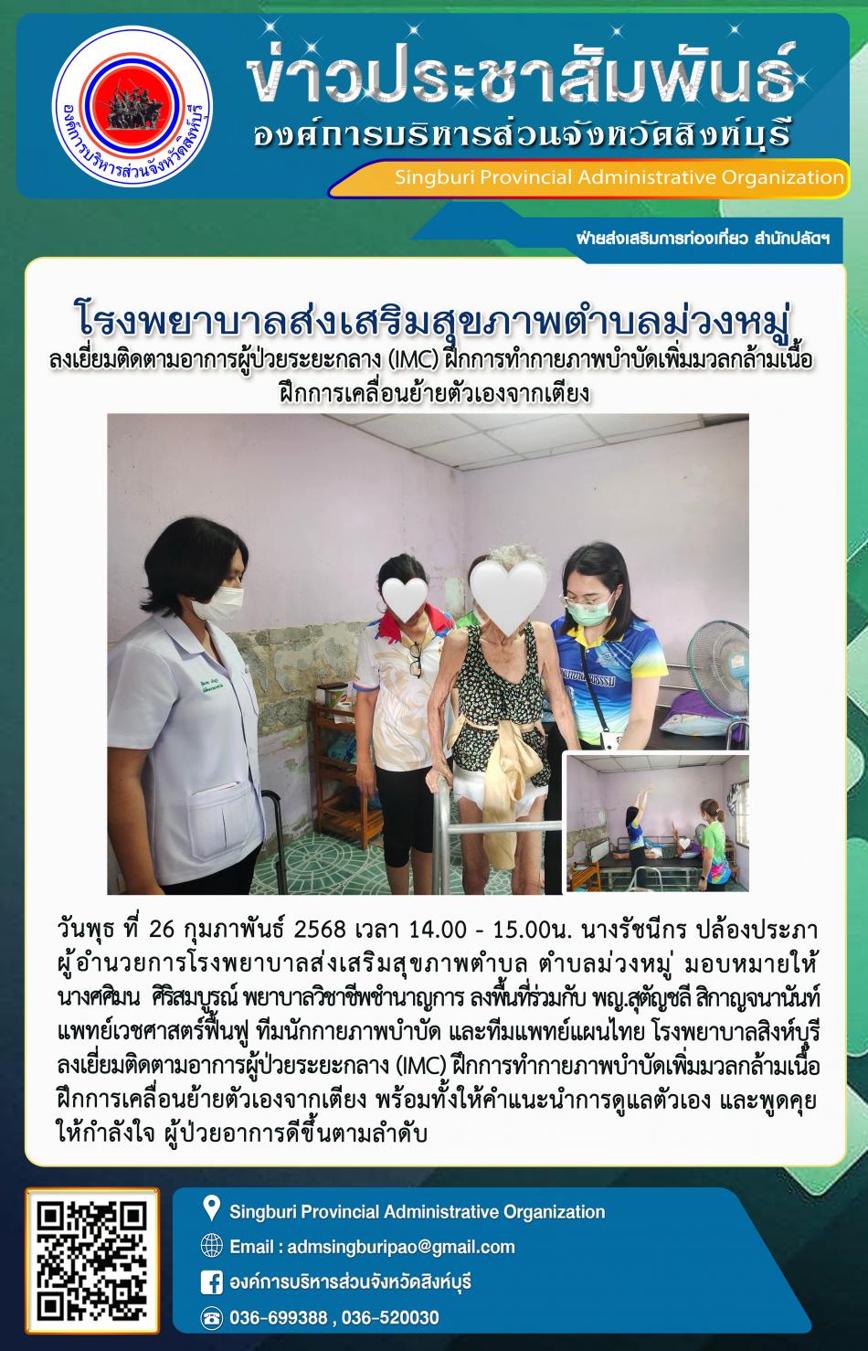 โรงพยาบาลส่งเสริมสุขภาพตำบลม่วงหมู่ ลงเยี่ยมติดตามอาการผู้ป่วยระยะ (IMC) ฝึกการทำกายภาพบำบัดเพิ่มมวลกล้ามเนื้อ ฝึกการเคลื่อนย้ายตัวเองจากเตียง [26 กุมภาพันธ์ 2568]
