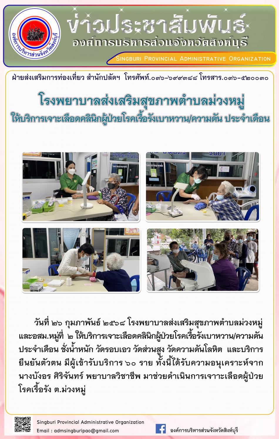 โรงพยาบาลส่งเสริมสุขภาพตำบลม่วงหมู่ ให้บริการเจาะเลือดคลินิกผู้ป่วยโรคเรื้อรังเบาหวาน/ความดัน ประจำเดือน [26 กุมภาพันธ์ 2568]