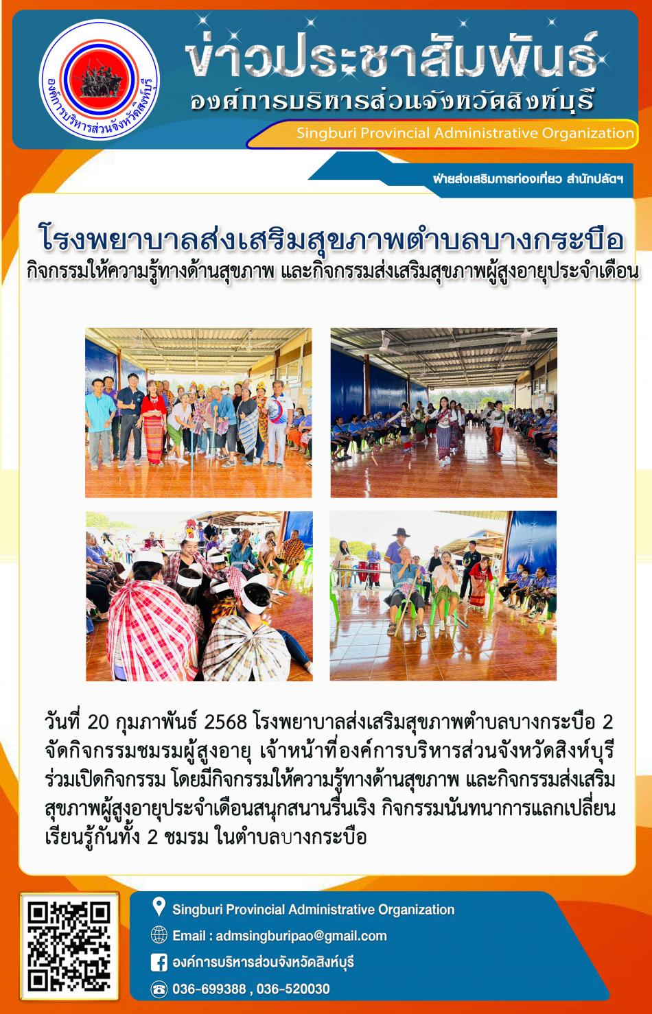 โรงพยาบาลส่งเสริมสุขภาพตำบลบางกระบือ กิจกรรมให้ความรู้ทางด้านสุขภาพ และกิจกรรมส่งเสริมสุขภาพผู้สูงอายุประจำเดือน [20 กุมภาพันธ์ 2568]