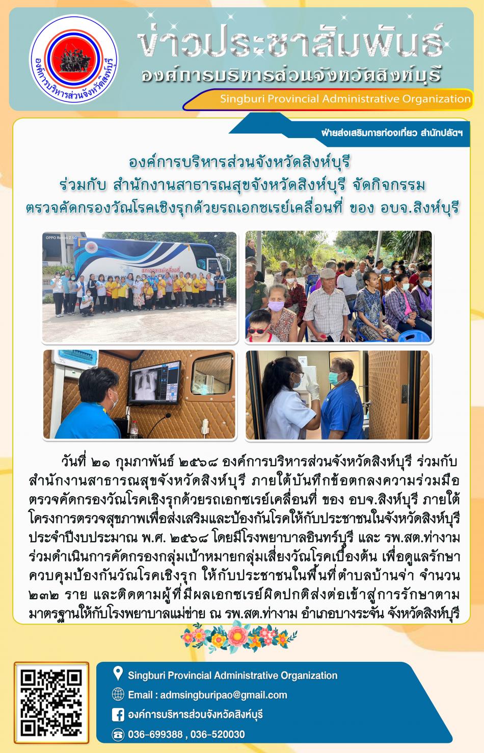 องค์การบริหารส่วนจังหวัดสิงห์บุรี ร่วมกับสาธาณสุขจังหวัดสิงห์บุรี จัดกิจกรรมตรวจคัดกรองวัณโรคเชิงรุกด้วยรถเอกซเรย์เคลื่อนที่ องค์การบริหารส่วนจังหวัดสิงห์บุรี ในพื้นที่ตำบลท่างาม [21 กุมภาพันธ์ 2568]