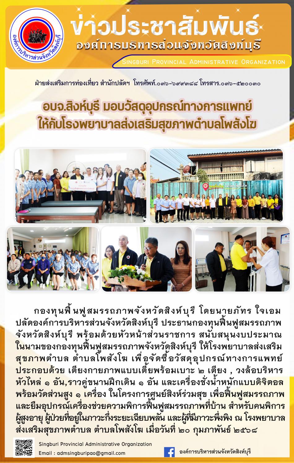อบจ.สิงห์บุรี มอบวัสดุอุปกรณทางการแพทย์ ให้กับโรงพยาบาลส่งเสริมสุขภาพตำบลโพสังโฆ [20 กุมภาพันธ์ 2568]