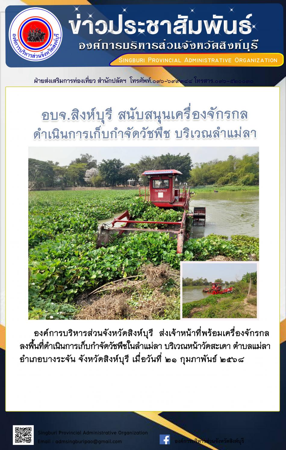 อบจ.สิงห์บุรี ส่งเจ้าหน้าที่พร้อมเครื่องจักรกล เก็บกำจัดวัชพืช บริเวณลำแม่ลา [21 กุมภาพันธ์ 2568]