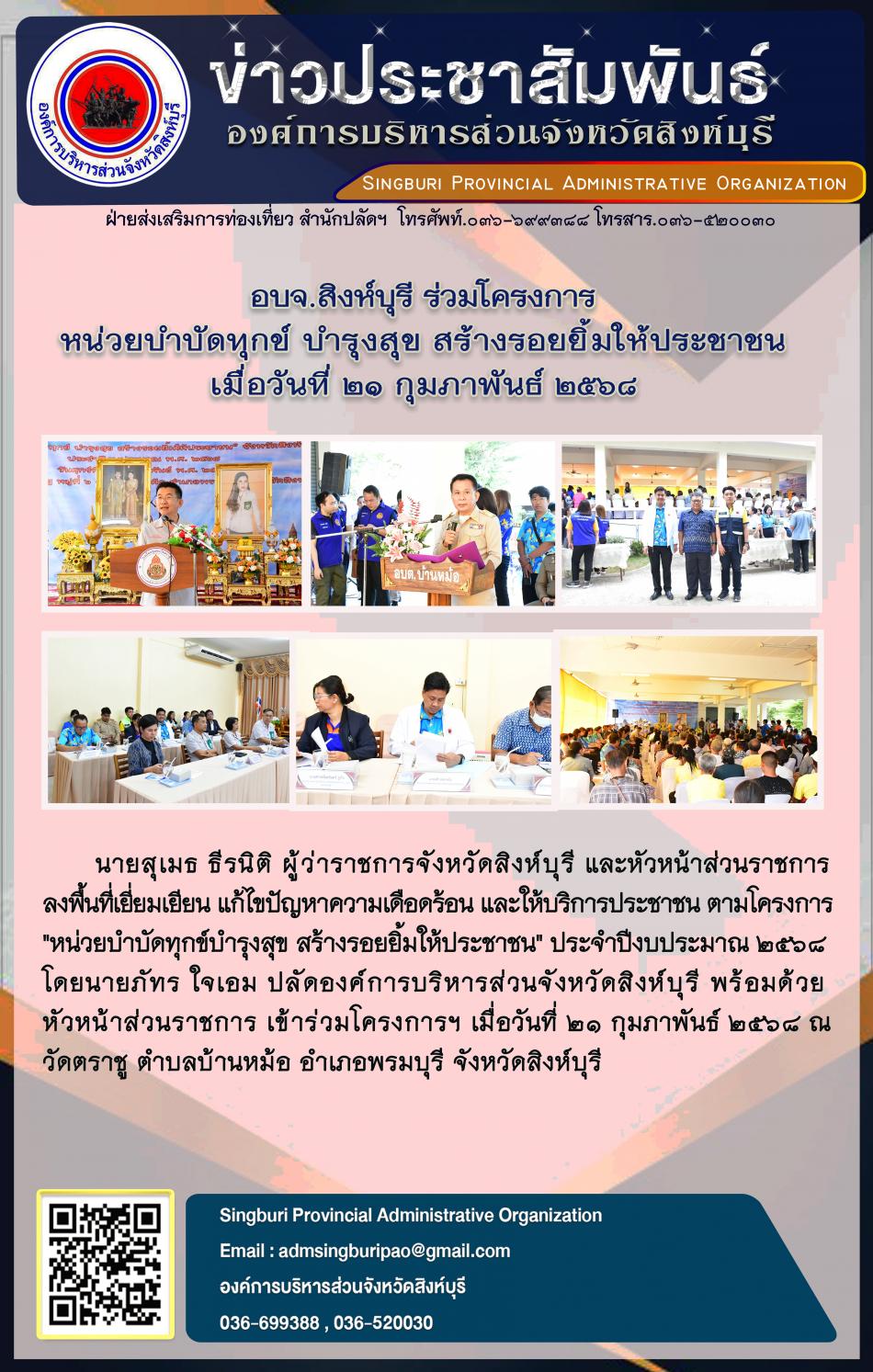อบจ.สิงห์บุรี ร่วมโครงการ"หน่วยบำบัดทุกข์ บำรุงสุข สร้างรอยยิ้มให้ประชาชน" [21 กุมภาพันธ์ 2568]