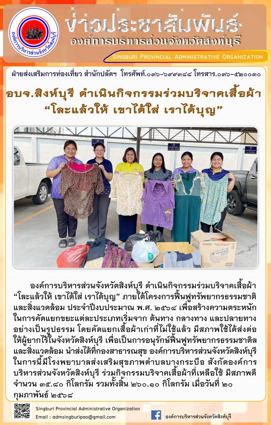 อบจ.สิงห์บุรี ดำเนินกิจกรรมร่วมบริจาคเสื้อผ้า " โละแล้วให้ เขาใส่ได้ เราได้บุญ" [20 กุมภาพันธ์ 2568]