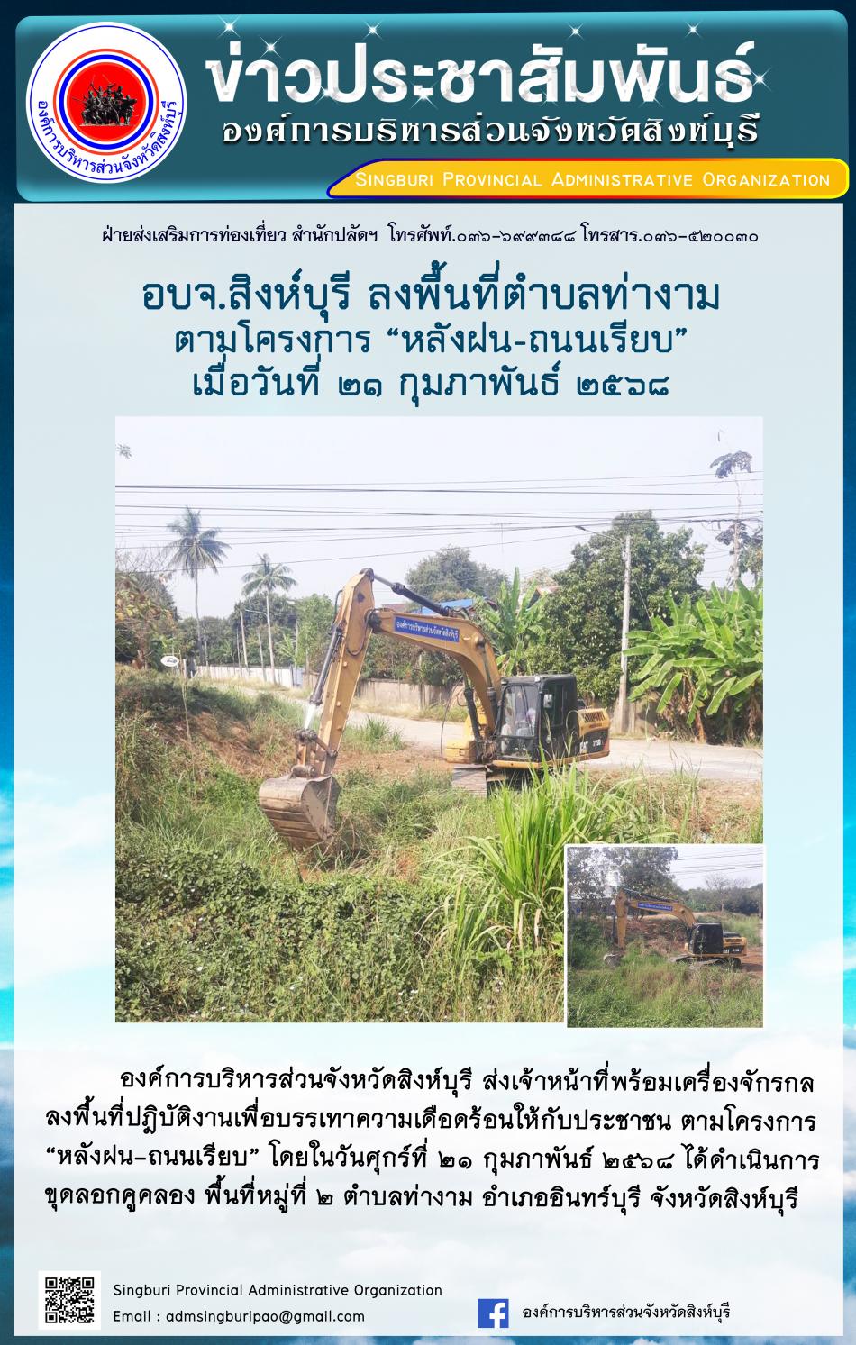 อบจ.สิงห์บุรี ลงพื้นที่ ตำบลท่างาม ตามโครงการ "หลังฝน - ถนนเรียบ" [21 กุมภาพันธ์ 2568]