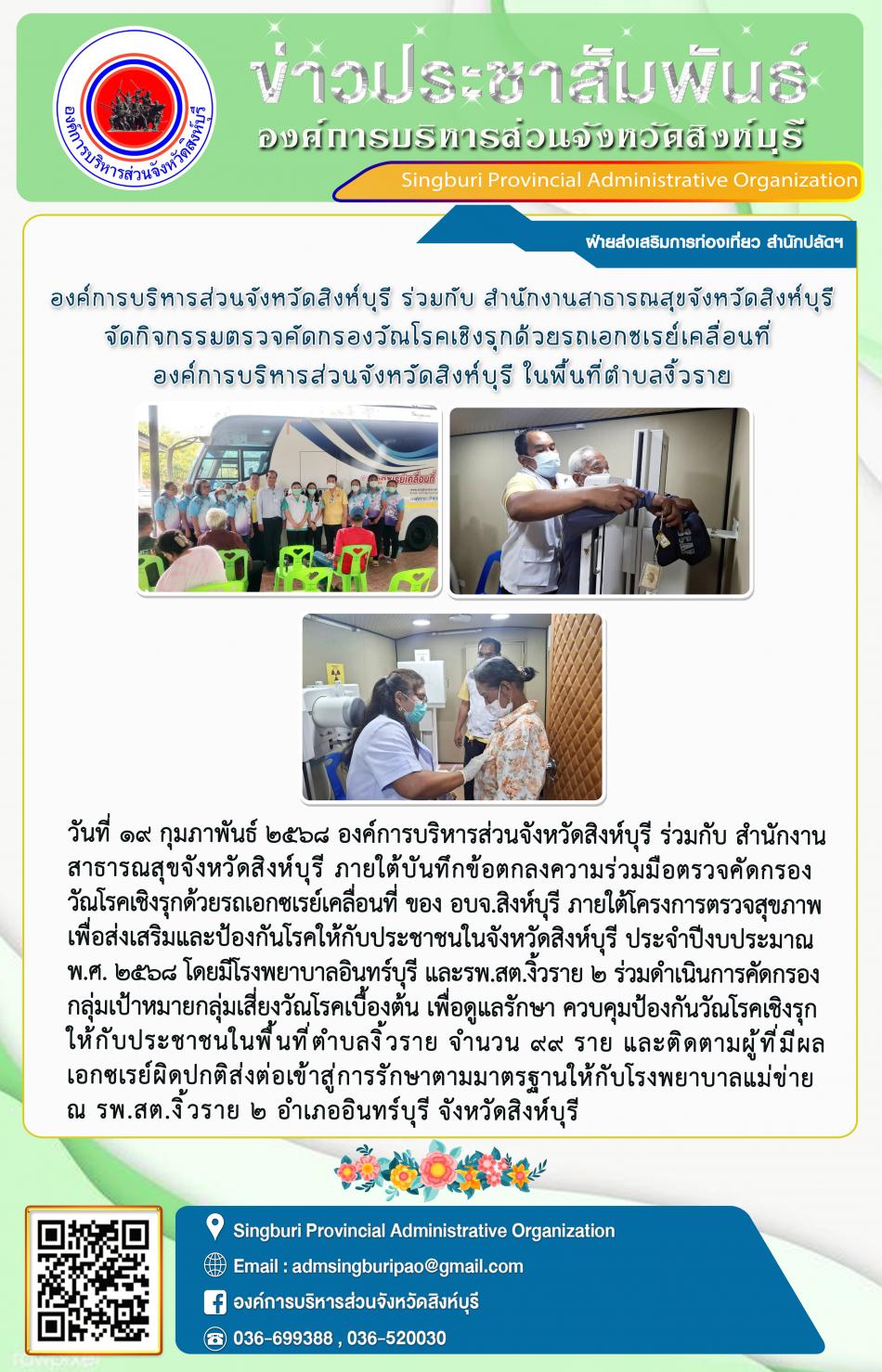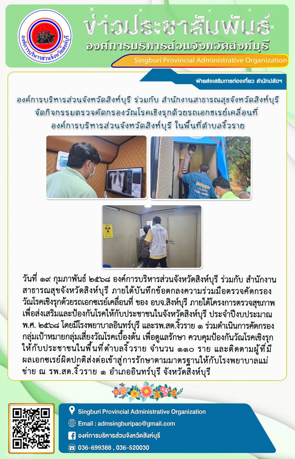 องค์การบริหารส่วนจังหวัดสิงห์บุรี ร่วมกับสาธาณสุขจังหวัดสิงห์บุรี จัดกิจกรรมตรวจคัดกรองวัณโรคเชิงรุกด้วยรถเอกซเรย์เคลื่อนที่ องค์การบริหารส่วนจังหวัดสิงห์บุรี ในพื้นที่ตำบลงิ้วราย [19 กุมภาพันธ์ 2568]