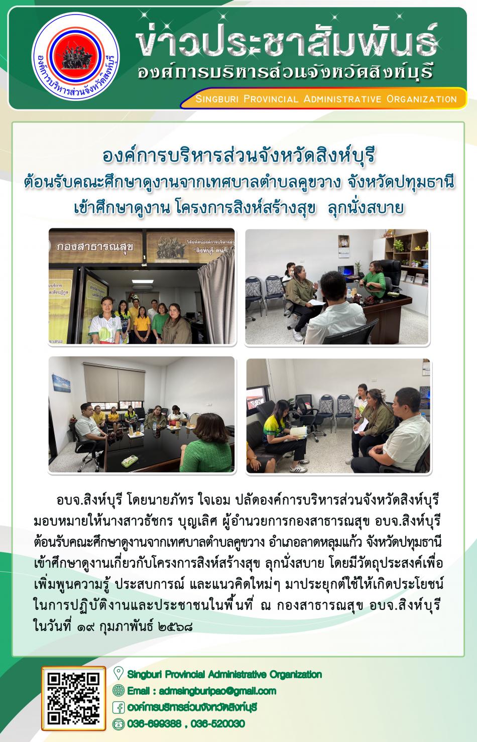 องค์การบริหารส่วนจังหวัดสิงห์บุรี ต้อนรับคณะศึกษาดูงานจากเทศบาลตำบลคูขวาง จังหวัดปทุมธานี เข้าศึกษาดูงาน โครงการสิงห์สร้างสุข ลุกนั่งสบาย [19 กุมภาพันธ์ 2568]