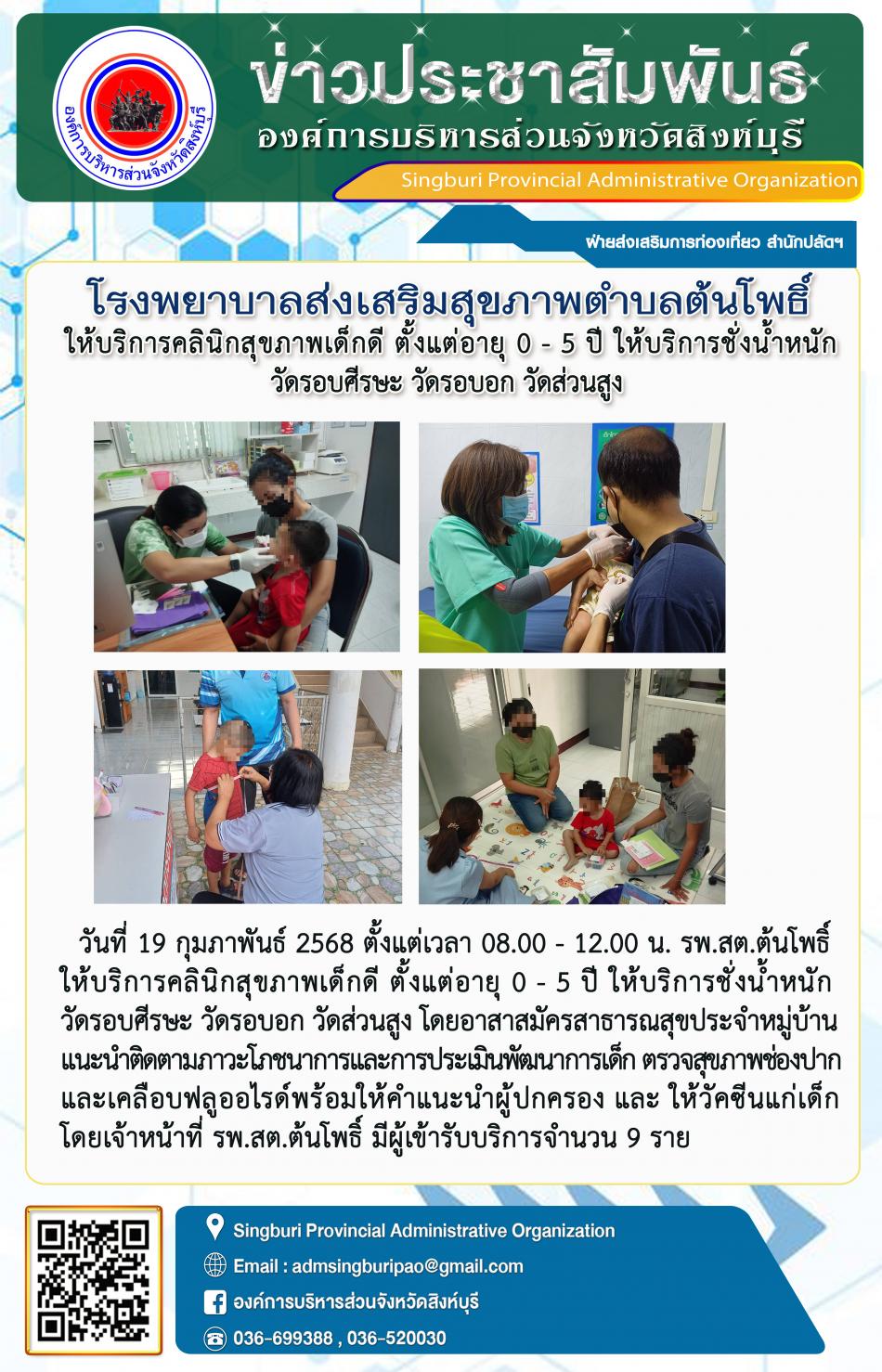โรงพยาบาลส่งเสริมสุขภาพตำบลต้นโพธิ์ ให้บริการคลินิกสุขภาพเด็กดี ตั้งแต่อายุ 0 - 5 ปี ให้บริการั่งน้ำหนัก วัดรอบศีรษะ วัดรอบอก วัดส่วนสูง [19 กุมภาพันธ์ 2568]