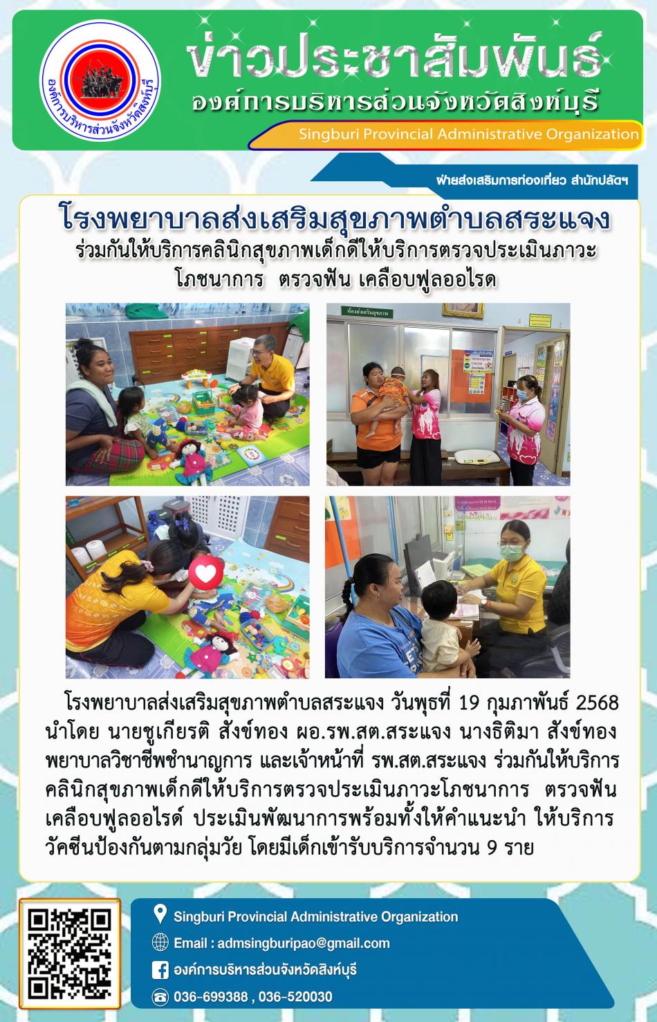 โรงพยาบาลส่งเสริมสุขภาพตำบลสระแจง ร่วมกันให้บริการคลินิกสุขภาพเด็กดีให้บริการตรวจประเมินภาวะ โภชนาการ ตรวจฟัน เคลือบฟูลออไรด [19 กุมภาพันธ์ 2568]