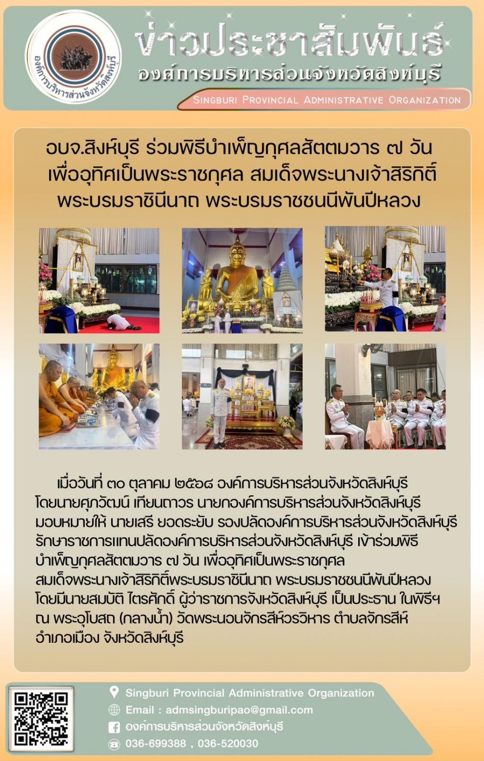 อบจ.สิงห์บุรี ร่วมพิธีบำเพ็ญกุศลสัตตมวาร 7 วัน เพื่ออุทิศเป็นพระราชกุศล สมเด็จพระนางเจ้าสิริกิติ์ พระบรมราชินีนาถ พระบรมราชชนนีพันปีหลวง [30 ตุลาคม 2568]