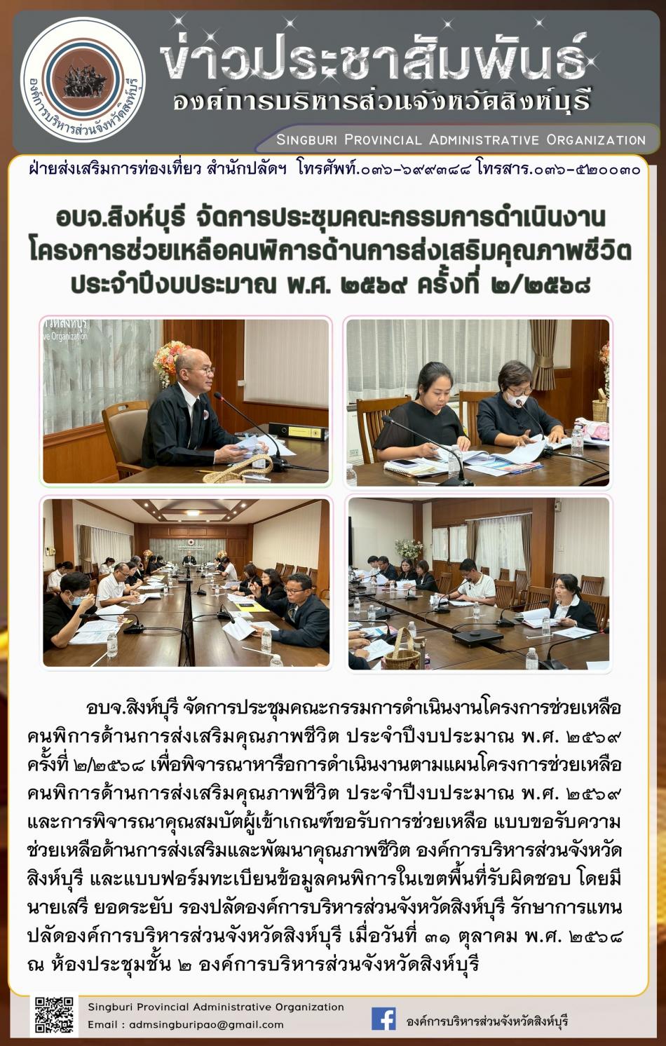 อบจ.สิงห์บุรี จัดการประชุมคณะกรรมการดำเนินงานโครงการช่วยเหลือคนพิการด้านการส่งเสริมคุณภาพชีวิต ประจำปีงบประมาณ พ.ศ. .2569 ครั้งที่ 2/2568 [31 ตุลาคม 2568]