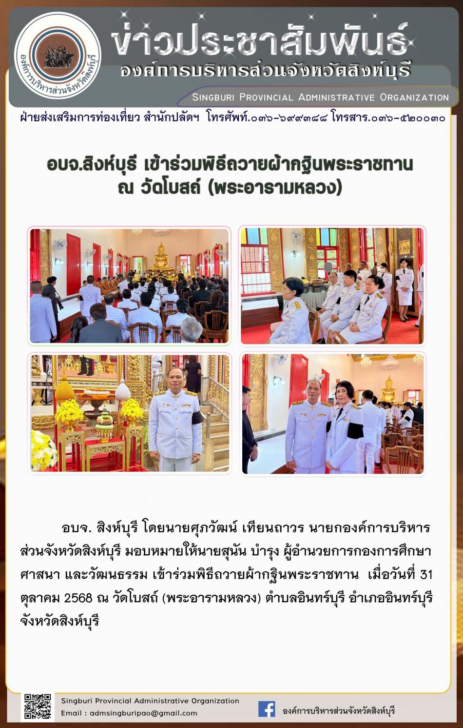 อบจ.สิงห์บุรี เข้าร่วมพิธีถวายผ้ากฐินพระราชทาน ณวัดโอสถ์ ( พระอารามหลวง) [31 ตุลาคม 2568]
