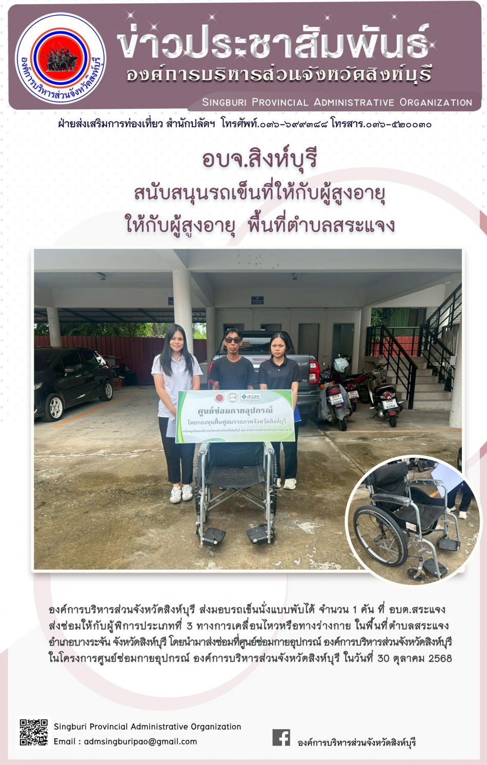 อบจ.สิงห์บุรี สนับสนุนรถเข็นนั่งให้กับผู้สูงอายุ พื้นที่ตำบลสระแจง [30 ตุลาคม 2568]