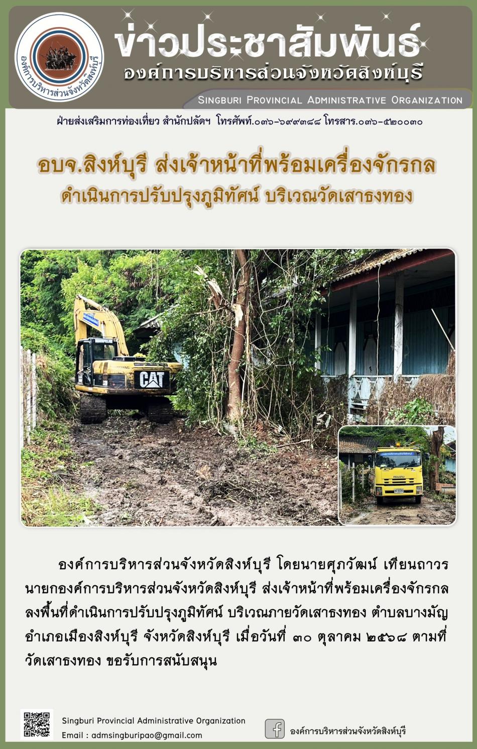 อบจ.สิงห์บุรี ส่งเจ้าหน้าที่พร้อมเครื่องจักรกล ดำเนินการปรับปรุงภูมิทัศน์ บริเวณวัดเสาธงทอง [30 ตุลาคม 2568]