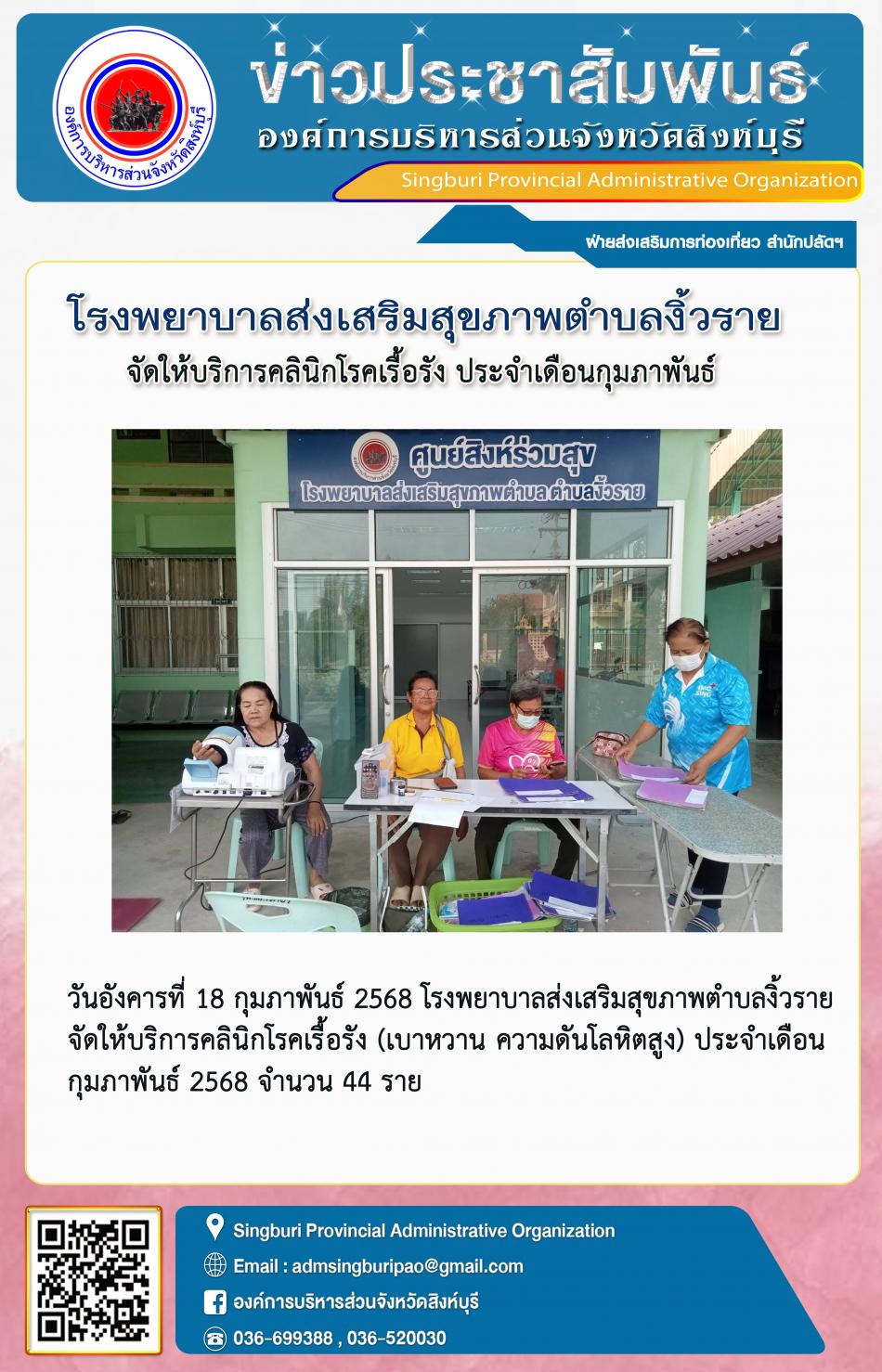 โรงพยาบาลส่งเสริมสุขภาพตำบลงิ้วราย จัดให้บริการคลินิกโรคเรื้อรัง ประจำเดือนกุมภาพันธ์ [18 กุมภาพันธ์ 2568]