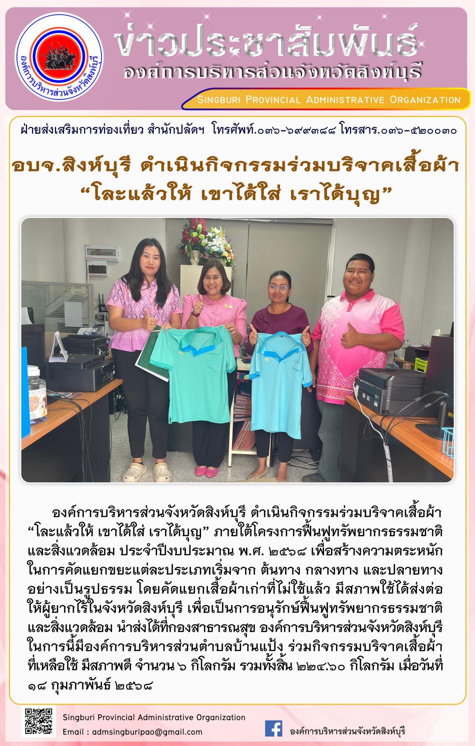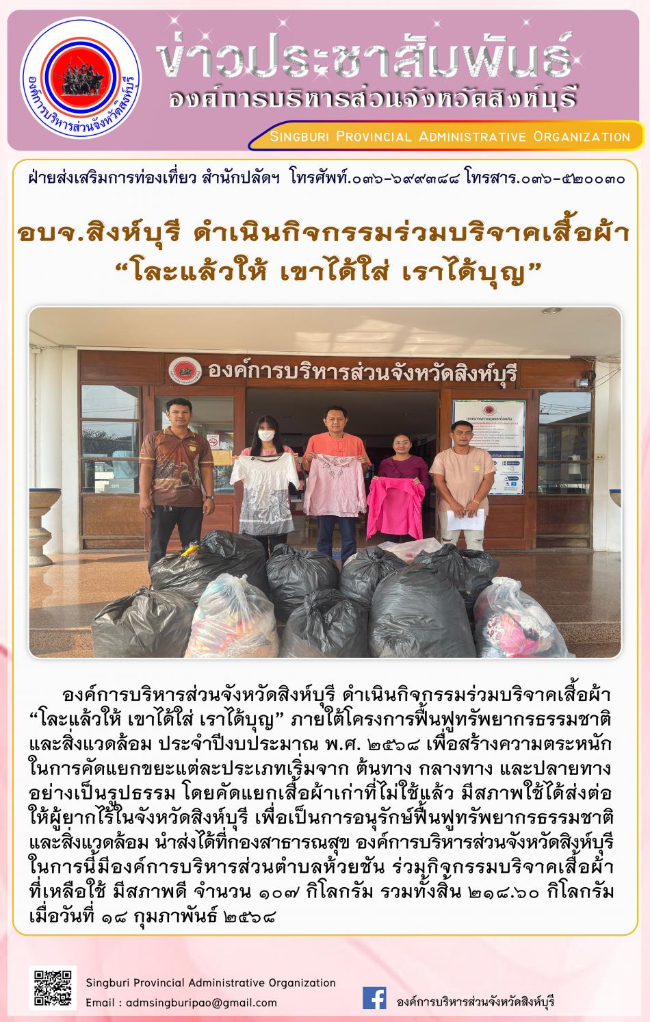 อบจ.สิงห์บุรี ดำเนินกิจกรรมร่วมบริจาคเสื้อผ้า " โละแล้วให้ เขาใส่ได้ เราได้บุญ" [18 กุมภาพันธ์ 2568]