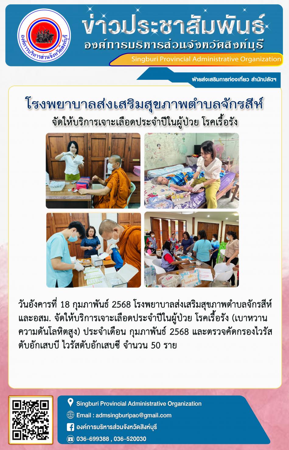 โรงพยาบาลส่งเสริมสุขภาพตำบลจักรสีห์ จัดให้บริการเจาะเลือดประจำปีในผู้ป่วย โรคเรื้อรัง [18 กุมภาพันธ์ 2568]