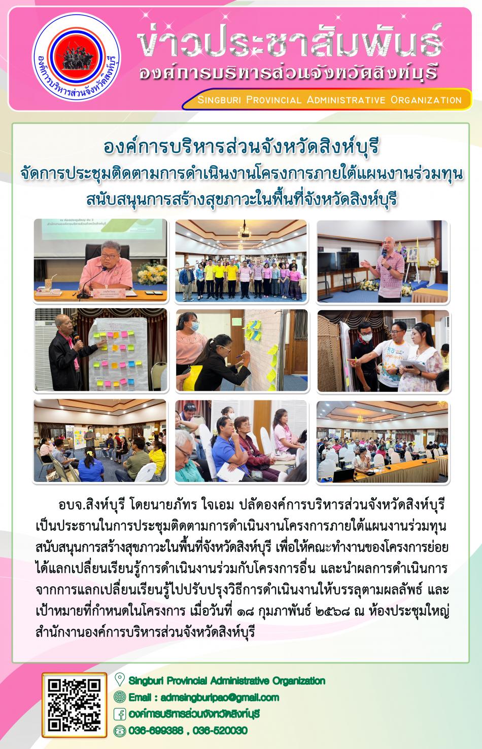องค์การบริหารส่วนจังหวัดสิงห์บุรี จัดการประชุมติดตามการดำเนินงานโครงการภายใต้แผนงานร่วมทุน สนับสนุนการสร้างสุขภาวะในพื้นที่จังหวัดสิงห์บุรี [18 กุมภาพันธ์ 2568]