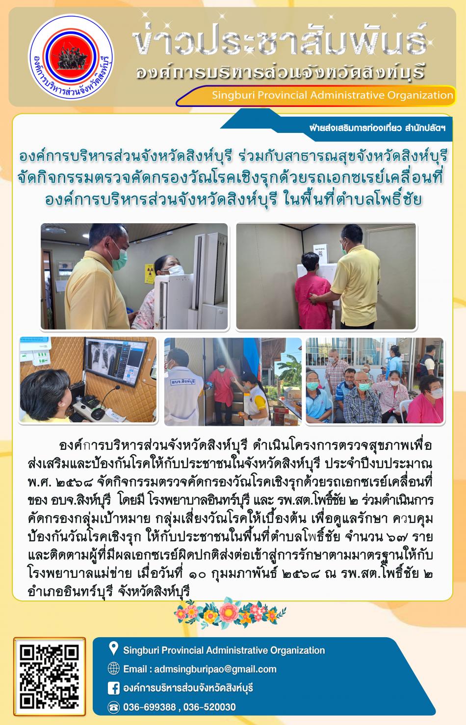 องค์การบริหารส่วนจังหวัดสิงห์บุรี ร่วมกับ สำนักงานสาธารณสุขจังหวัดสิงห์บุรี จัดกิจกรรมตรวจคัดกรองวัณโรคเชิงรุกด้วยรถเอกซเรย์เคลื่อนที่องค์การบริหารส่วนจังหวัดสิงห์บุรี ในพื้นที่ตำบลโพธิ์ชัย [10 กุมภาพันธ์ 2568]